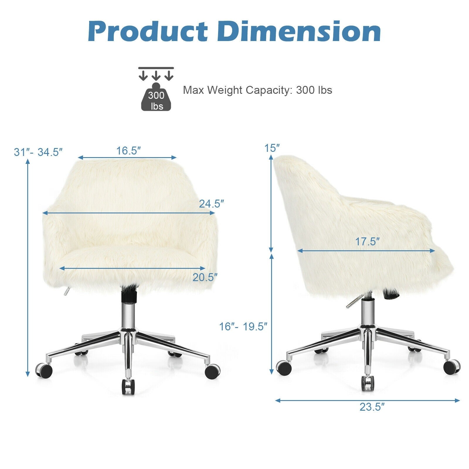 This elegant fluffy swivel office chair will become a perfect addition to your house! Constructed from a heavy-duty 5-claw metal base, this chair is sturdy enough to support up to 300 lbs. Besides, a heavy-duty galvanized gas rod ensures high safety and stability for reliable use. You will sit comfortably and feel relaxed thanks to the wide backrest, cozy armrests, and thick sponge-padded seat. What's more, long soft faux fur with a skin-friendly touch will offer you extra comfort. The seat height can be easily adjusted to meet your ideal position. 5 flexible wheels offer fluent and quick movement, causing lower noise and less scratch on different floors. This modern and comfortable chair is suitable for various occasions and can be used as a makeup chair, accent chair, and computer chair as per your preference.