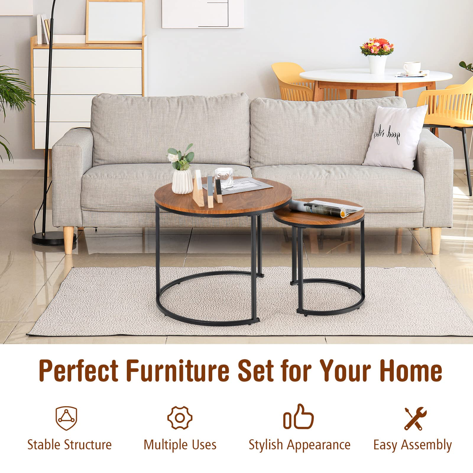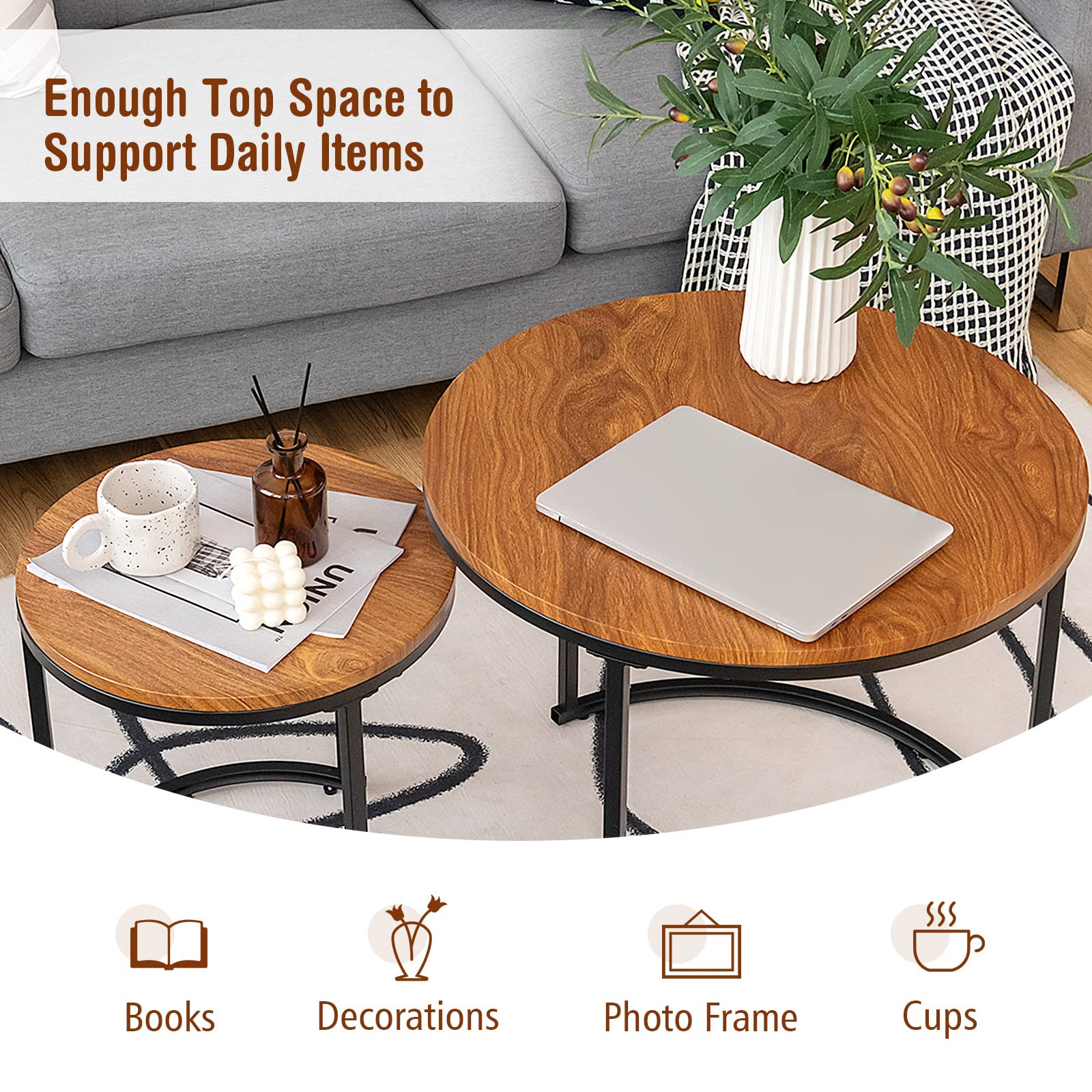 Our nesting coffee tables keep a good balance between practical use and antique design! The ingenious round design makes it combined at will to satisfy different needs. You can use this coffee table set separately or stack together. When not in use, the small table can be stored under the large one. Besides, the compact design is perfect for small space and works equally well near the bed or sofa. The wide tabletop is convenient for you to take and put daily things. The coffee table set is easy to assemble and clean. Designed with vintage style, this nesting table coffees are charming complement to your bedroom and living room, which can be used as a side table, end table, nightstand, etc.