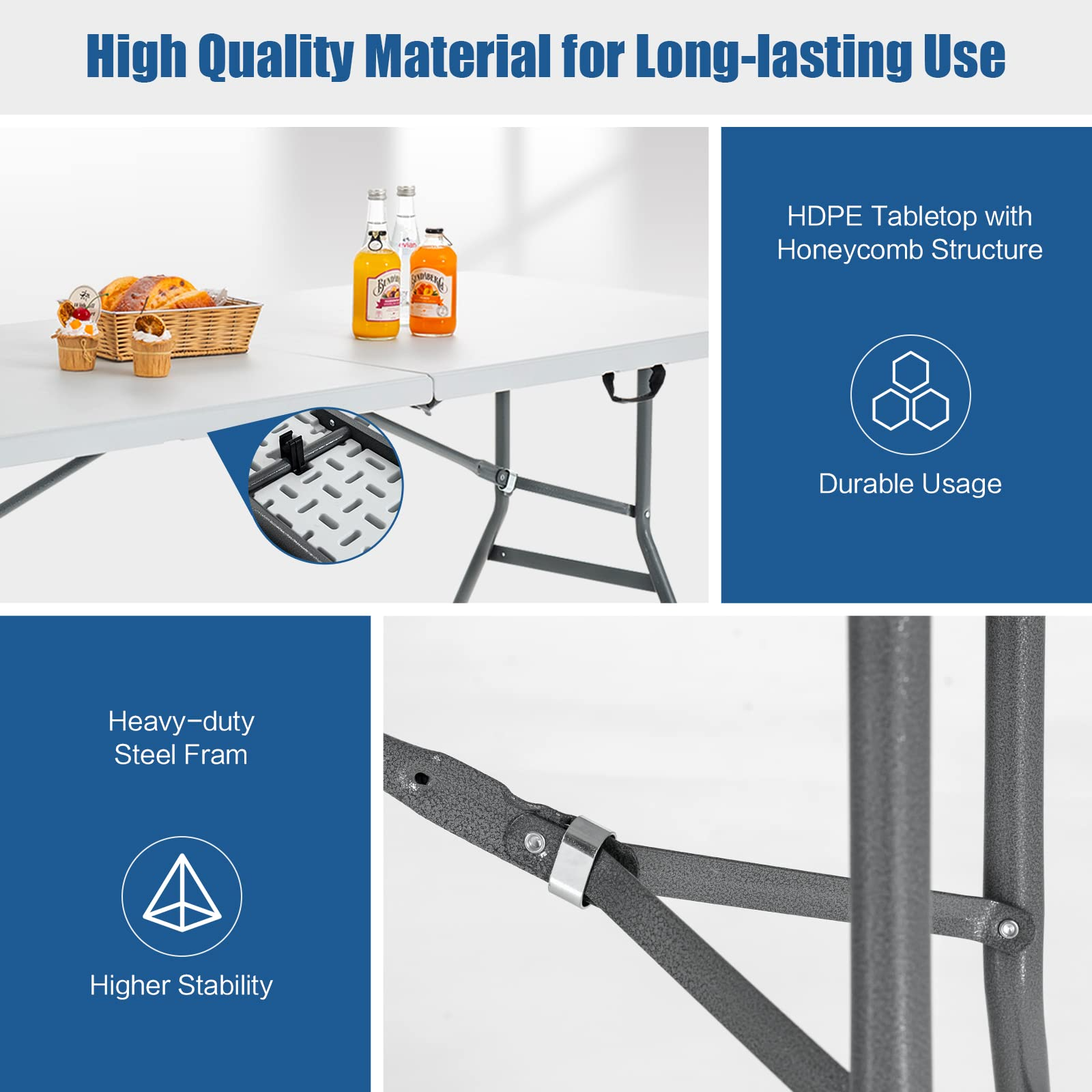 Are you looking for a folding table for indoor and outdoor activities? Our camping table is worthy of remarking. It is made of heavy-duty steel frame and HDPE tabletop with honeycomb structure for worry-free use. In addition, smooth tabletop is spacious enough to hold food and beverages while accommodating 8 adults to sit together. When not in use, the folding design saves a lot of space and is easy to carry anywhere as needed. Our folding table is an ideal choice for indoor and outdoor activities, such as camping, picnic, barbecue, party, dining and more. Take it home and have fun with our folding table!