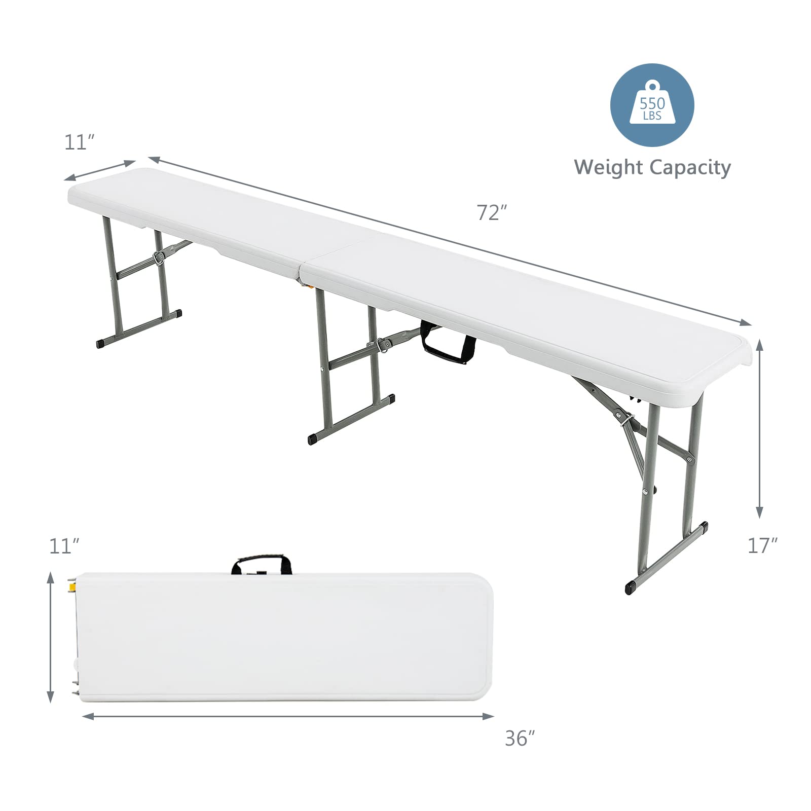 Our 6Ft portable multipurpose fold in half table is ideal for family reunions, picnics, camping trips, buffets and barbecues. The folding table is of HDPE table top powder coated steel frame. The heavy-duty bench is made of rustproof iron tubes with reliable support frame and honeycomb structure. Its strong weight capacity is up to 550 lbs. The lockable mechanism effectively enhances overall stability. This outdoor bench is just what you need for a sunny day and cool night, enjoying happy moments with friends, family, or loved ones. After being folded, it can be stored in any narrow place when not in use.