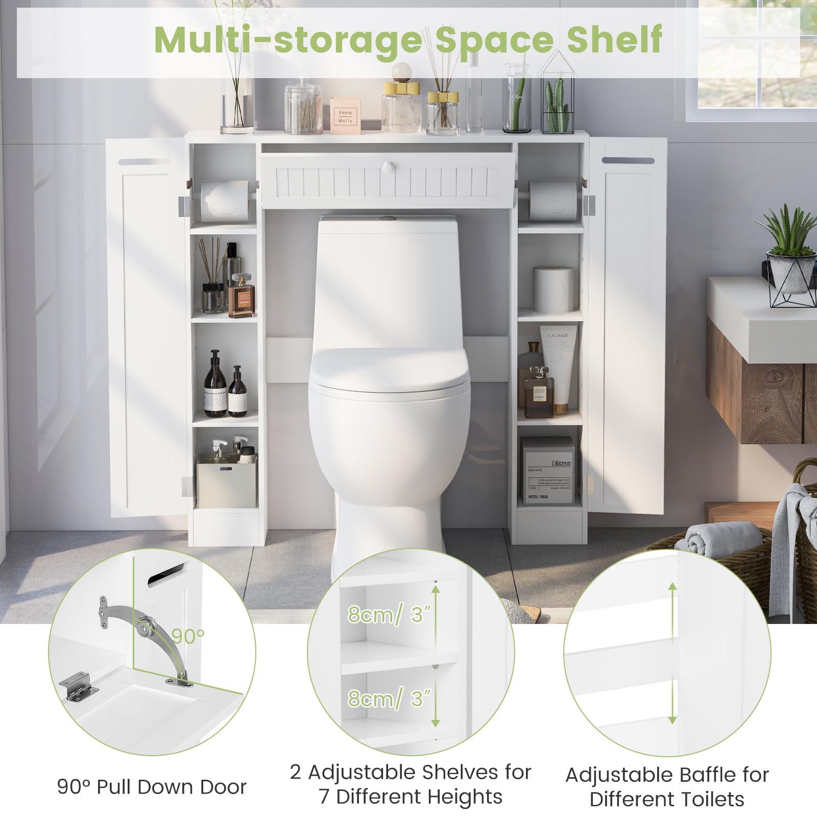 Our brand new clever and versatile bathroom spacesaver allows you to utilize extra space for all your bathroom storage needs. The generous center cabinets and two side cabinets allow you to organize and separate your personal products. Paper holder, one fixed shelf, and two adjustable shelves behind each side cabinet. A pull-down door at the center for holding some bath items. The cabinet provides excellent storage solutions for bathrooms with limited space. This bathroom space saver features sturdy MDF construction, and its white finish ensures that it will match and accent any existing decor. It is a free-standing furniture piece, which conveniently fits over standard toilet tanks and adds easy storage for roll paper and other bathroom necessities. Don't hesitate to buy it!