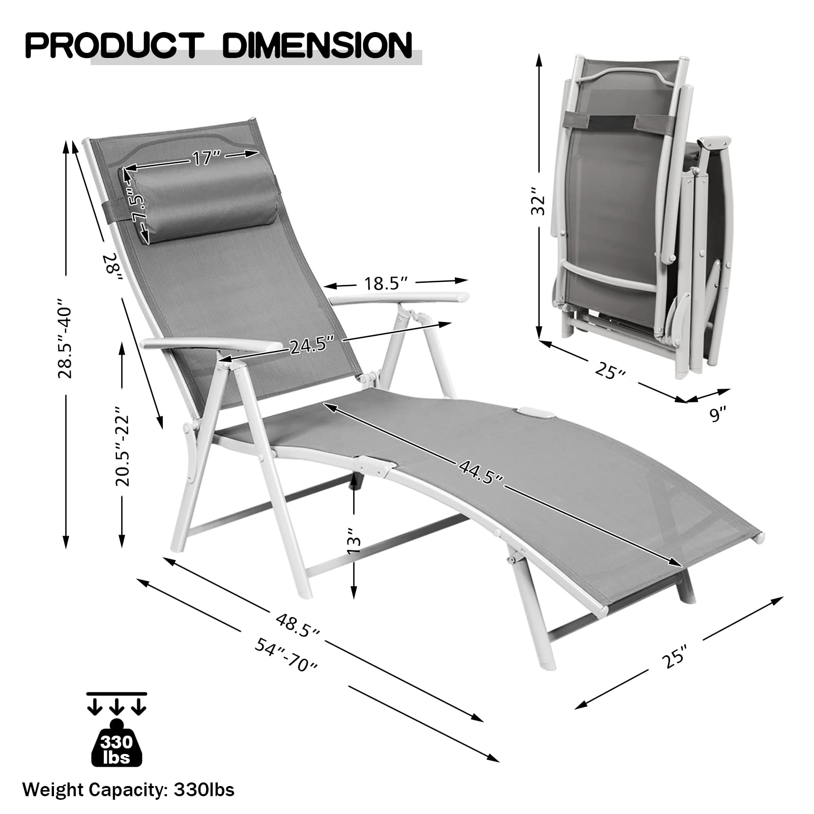 • Space Saving & Foldable Design: When not in use, the reclining lounger can be quickly folded into a compact size which saves much space for storage and much effort for transport. And there is no need to assemble. You can directly use the beach chair after taking it out. Overall dimension: 54"-70" x 25" x 28.5"-40"(L x W x H). Folding dimension: 32"x 25"x 9"(L x W x H). Weight capacity: 330 lbs.