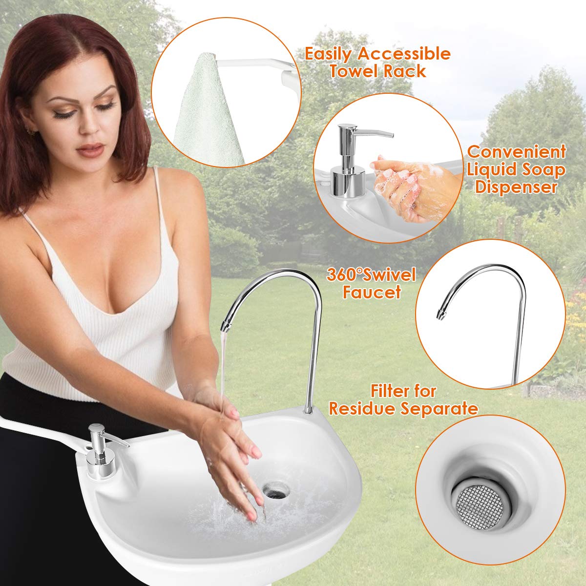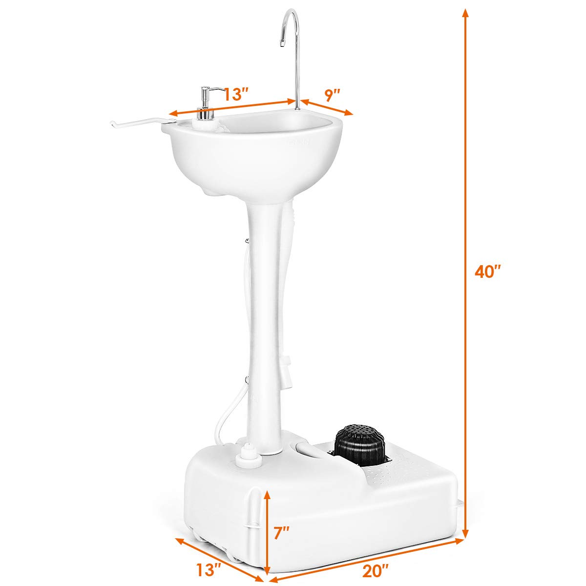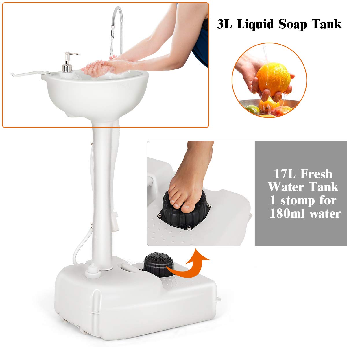 With the large separated water storage tank and foot pump, you can get water effortlessly by stepping on it without connecting it to the water valve. Suit for medical site, workplace or somewhere lacks water. All your emergency needs will be satisfied! This excellent hand-wash sink can also be used independently or cooperated with portable toilet or extra water tank.