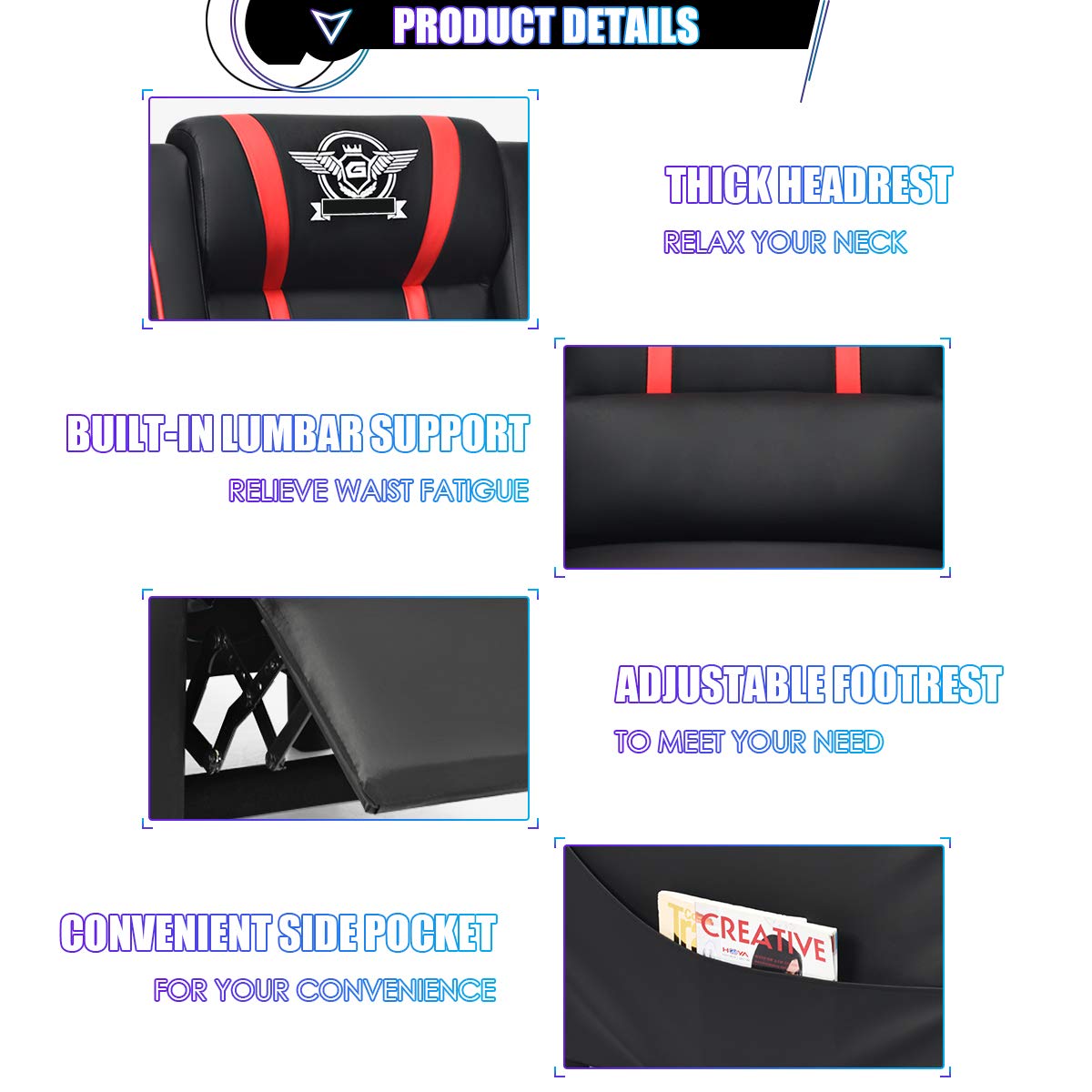 This gaming recliner is equipped with an adjustable backrest between?90 degrees to 160 degrees, which allows you to find the best angle for gaming, watching TV, or napping. A cozy armrest, soft headrest, massage lumbar pillow, and extending footrest can conform to the curve of the body to achieve ultimate relaxation. A highly elastic sponge with a smooth PU surface gives you an excellent resting experience. Modern look with gaming style makes it perfectly blend into any decor. It is ideal for living rooms, bedrooms, office, and more.