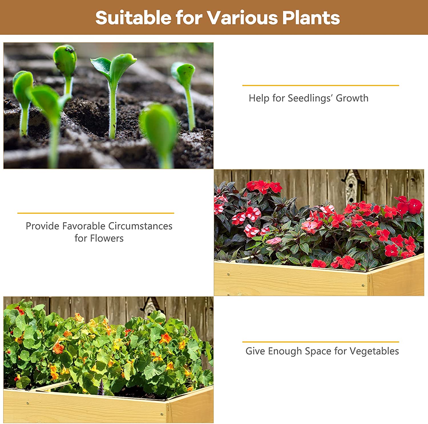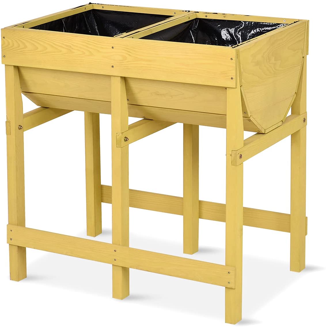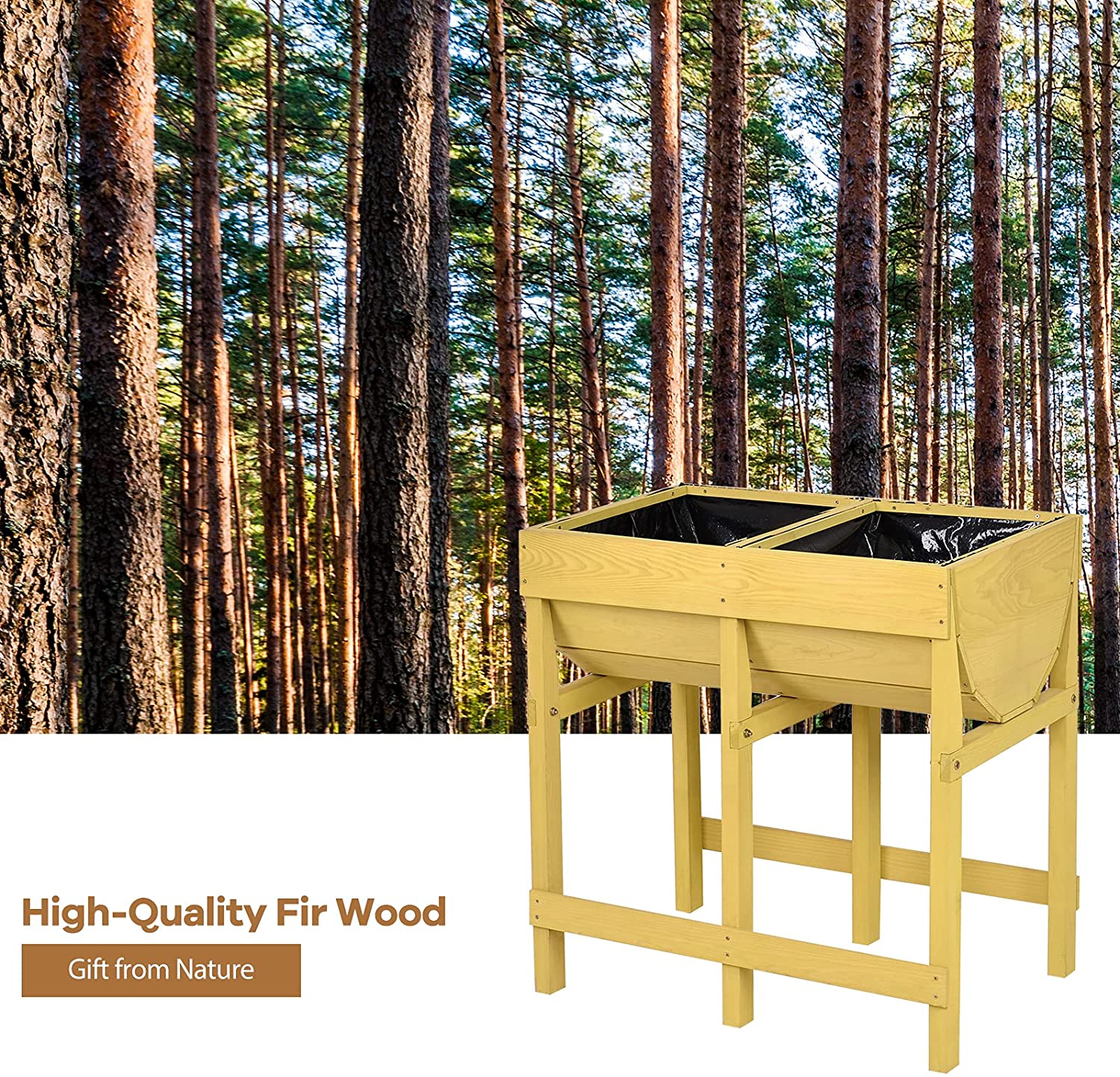 Do you want to have a wonderful flower planter? Have a look at our raised wooden flower planter, which is of good quality and new. It is made of wood, which is very natural. And its wooden construction makes it become more sturdy and durable, which can serve you for a long time. If you love planting flowers and other plants, this product will be right for you. Our flower planter has a fine design. It is raised and standing, which is easy for you to use. Designed in this way, you can do the planting without bending down. It is very comfortable. Our flower planter is a good display of garden. If you own it, you will feel pleasant. Whenever you walk into the garden, the flower planter can bring you a happy mood. Are you interested in our flower planter? Come and buy it!