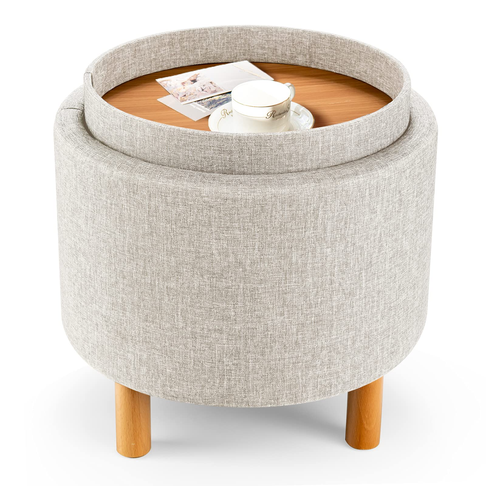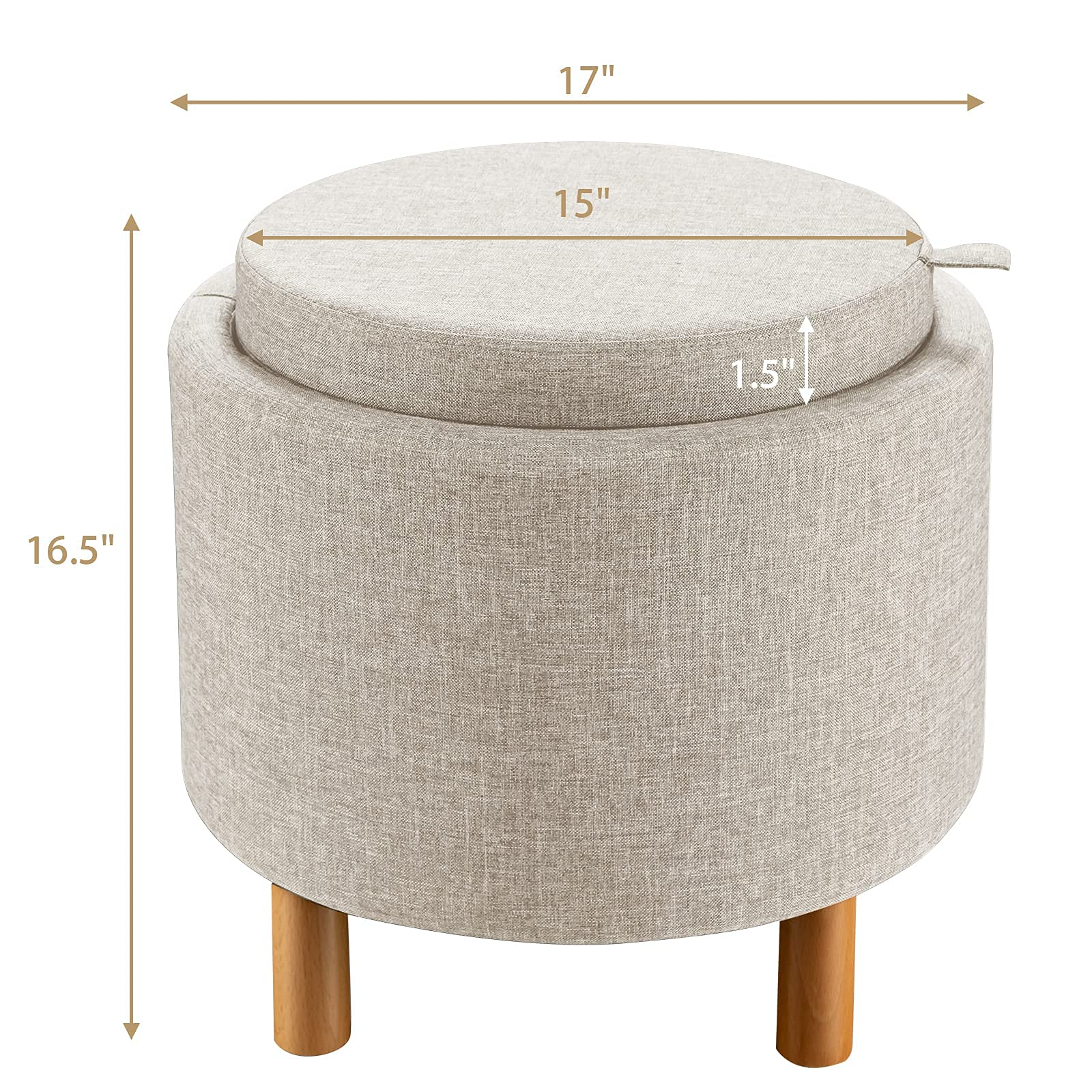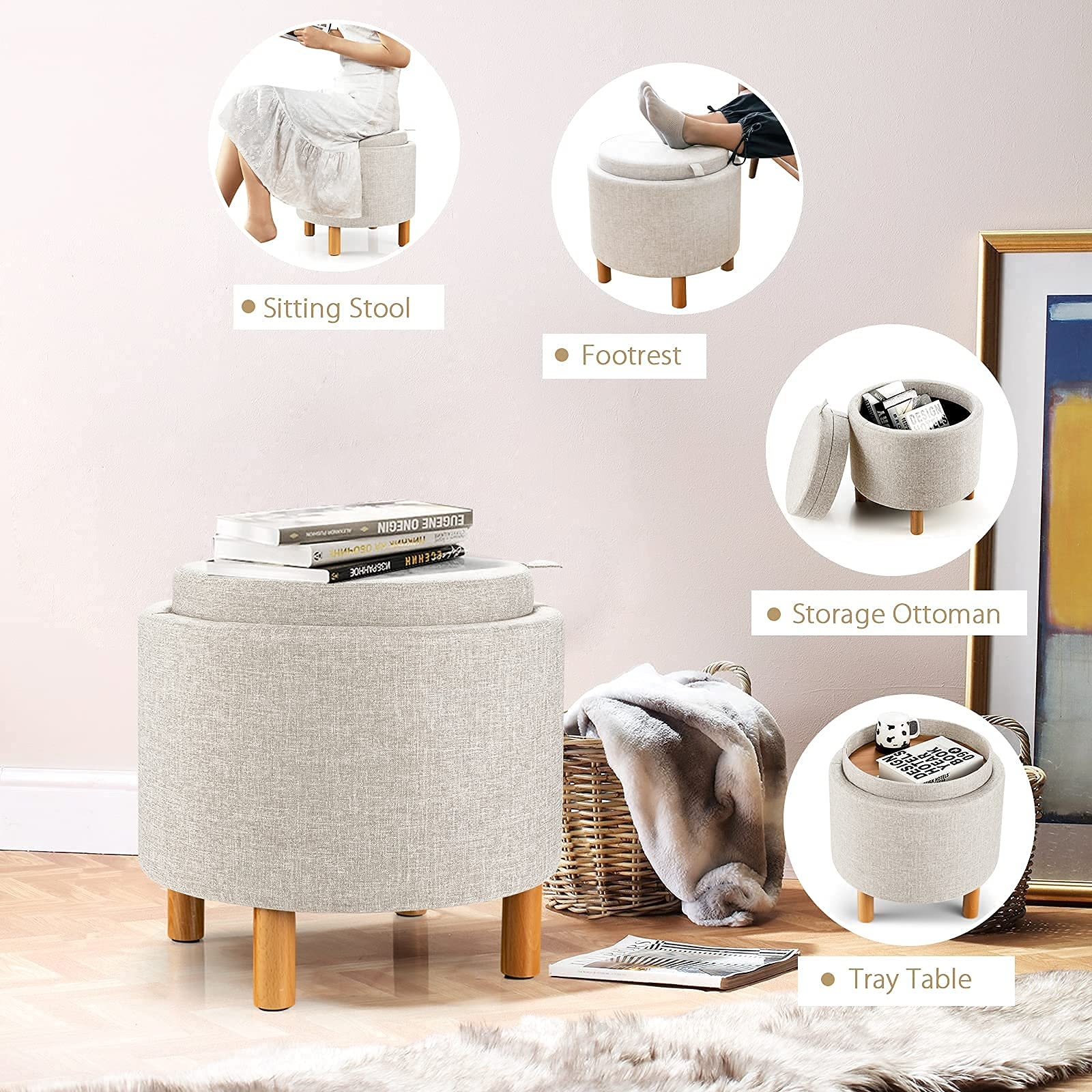 Our round storage ottoman features a removable 2-sided lid that combines an upholstered seat with a wooden serving tray. The ottoman, therefore, can be used as a footstool, an extra seat and a coffee table. Besides, a hidden compartment inside the ottoman offers ample storage space for sundries, helping you keep the room tidy and clean. Designed with the user' comfort and convenience in mind, the lightweight stool is soft padded and covered with breathable fabric. And the legs are made of solid pine wood and stuck with four non-slip foot pads for large bearing capacity and extra stability. With these above merits, our multifunctional ottoman will definitely be your great choice!