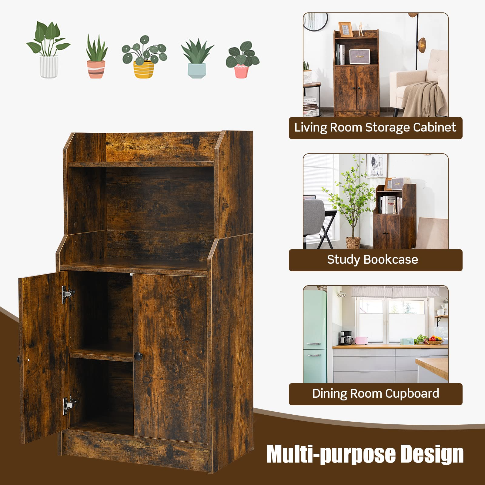 2-layer shelf and bottom cabinet enable you to store various daily items, such as plants, books, tableware, decorations and more. Besides, the removable and adjustable shelf with 5 height settings?allow you to place things of different heights. You can make full use of the storage space. Moreover, high-quality engineered wood material and metal hinges keep it durable and stable. Raised baffle protect your things from falling down. Furthermore, it can serve as a?bookcase, storage cabinet, cupboard and display shelving. It's suitable for your study, living room, bedroom, office. It's also easy to assemble and clean.