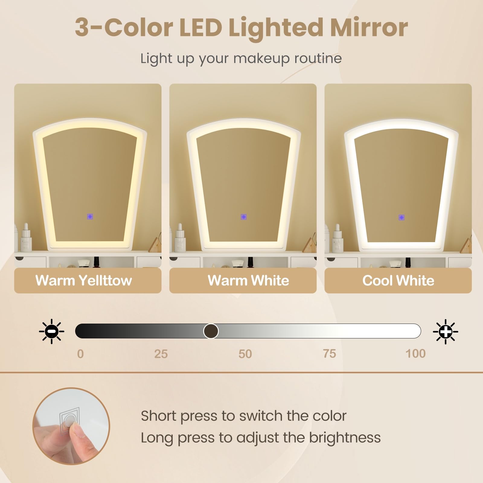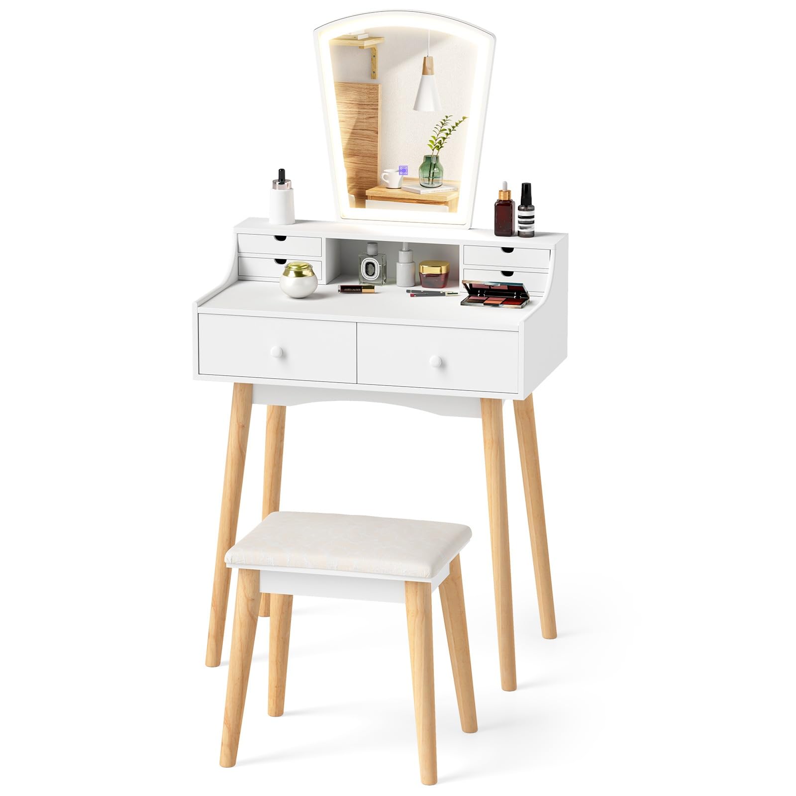 The lighted mirror allows you to illuminate your space with warm yellow, warm white or cool white lighting options for the perfect ambiance. The ample storage space includes an open shelf and multiple drawers for organized storage. Crafted with solid pine wood legs for elegance and durability, this set is completed with a comfortable, space-saving stool. A stylish and practical gift for loved ones, this modern dressing table adds sophistication to any room while providing a functional and chic solution for daily grooming routines.