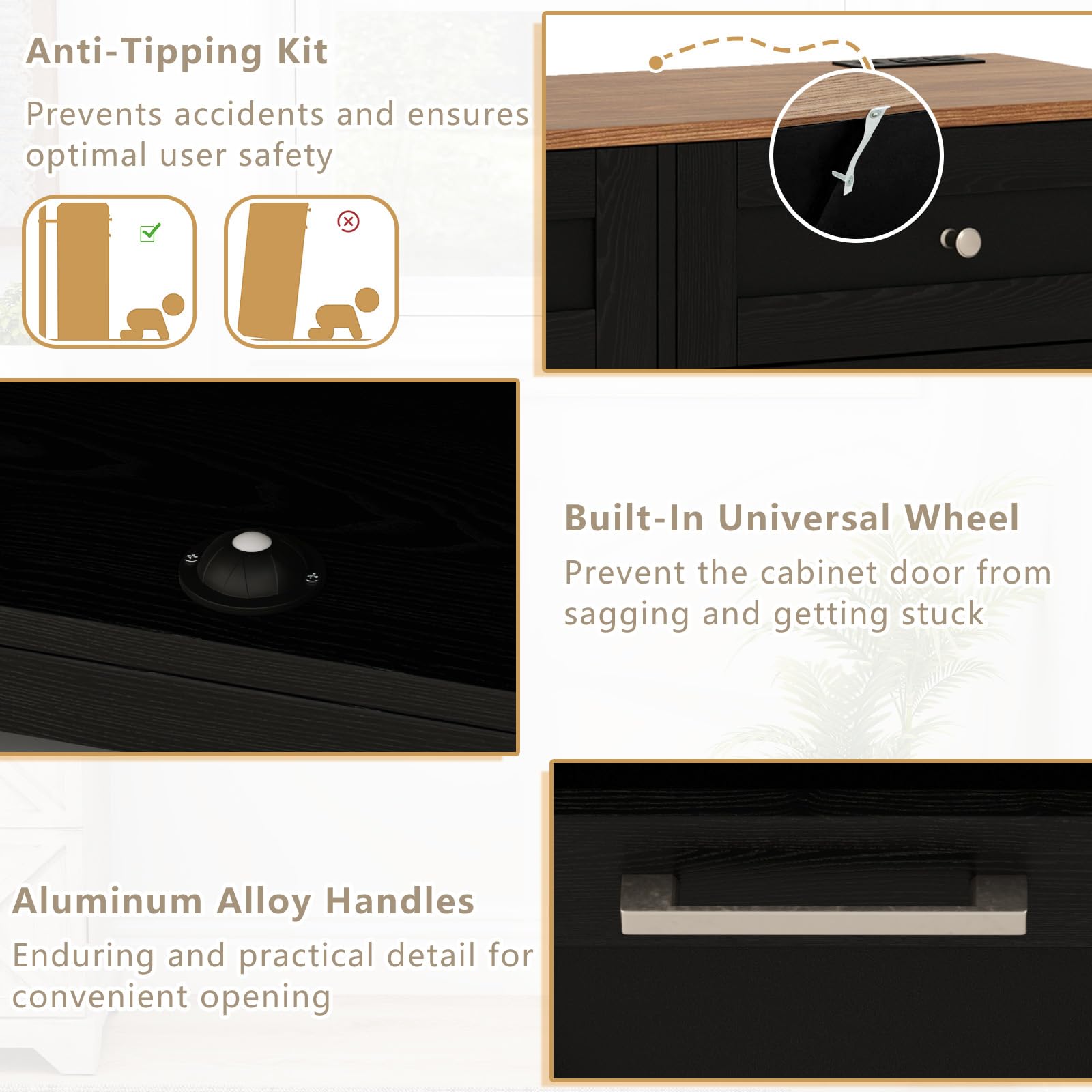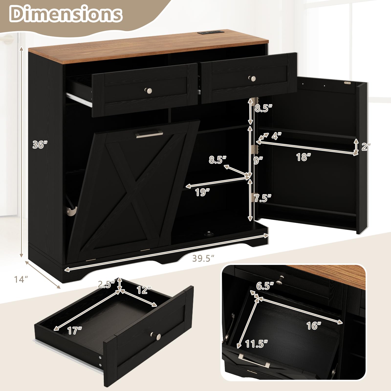 This stylish and functional piece offers a built-in charging station with 2 outlets and 2 USB ports to keep your devices ready. Hide unsightly trash with the tilt out garbage holder and enjoy easy bag replacement with the angled opening of 25°. The trash bin cabinet provides ample storage space with a spacious countertop, 2 drawers, and an enclosed cabinet. Side shelves on the pantry cabinet ensure easy access to essential ingredients. Meanwhile, this cabinet contains a 3-position adjustable shelf for free space arrangement. With a sturdy wooden construction supporting up to 284 lbs and anti-tipping features, the garbage cabinet ensures both safety and durability. A universal wheel is included to prevent the cabinet door from sagging and getting stuck. Designed with doors, the tilt out trash can cabinet will be a rustic focal point in any room.