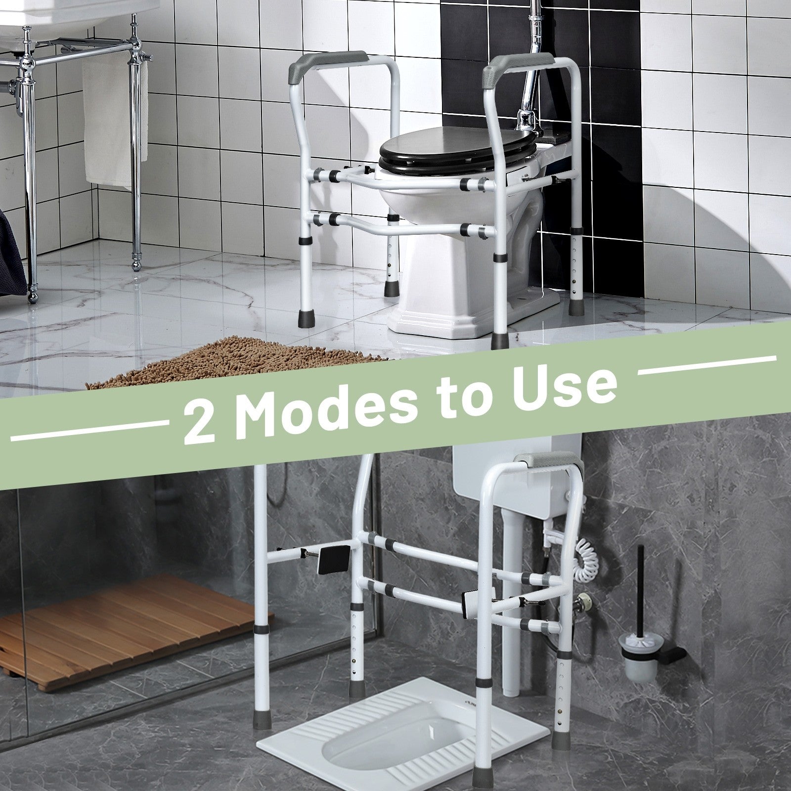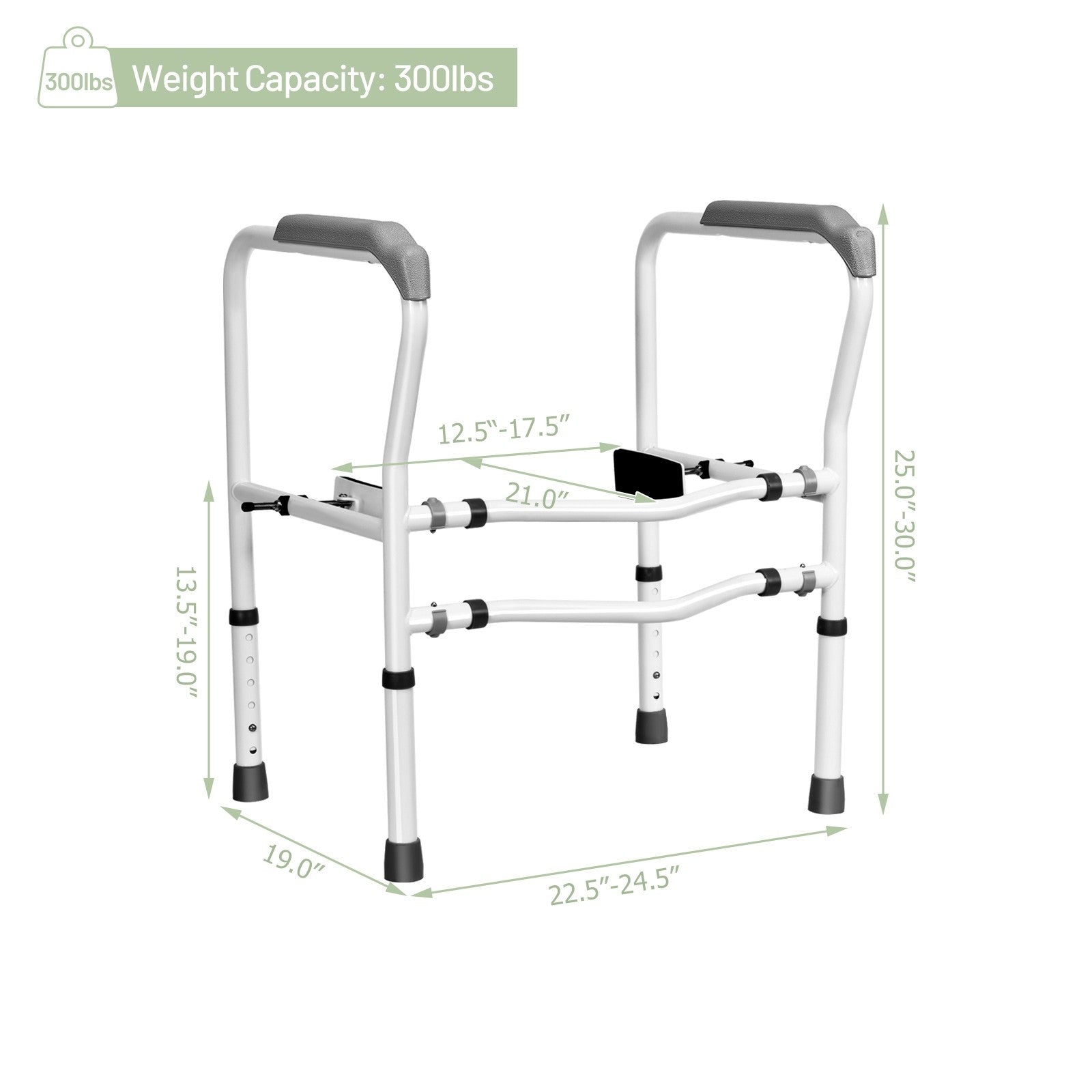 - Adjustable Height & Width In order to adapt to the different size of the toilet, we designed this armrest to be adjustable. By adjusting different gears, you can get toilet armrests of different heights (25inch-30inch) and widths (22.5inch/24.5inch). In addition to being placed next to the toilet, our handrails can also be used for squatting toilets.