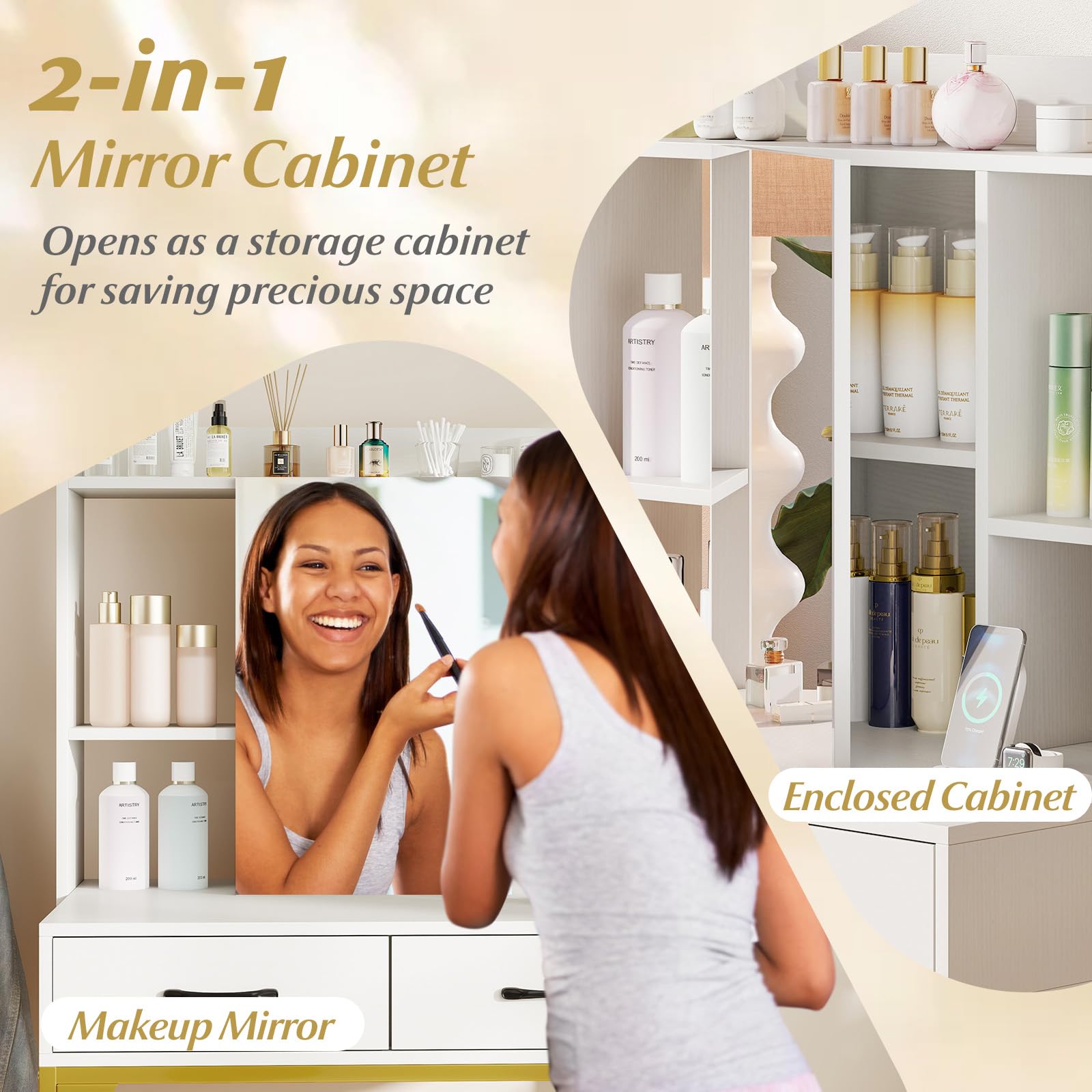 Upgrade your dressing area with this stylish vanity desk and stool set. The built-in charging station with 2 AC outlets, USB, and Type-C ports keeps your devices powered and accessible. With multiple shelves, a mirrored cabinet, and drawers, it offers ample storage for cosmetics and accessories. Sturdy construction with anti-tip devices and adjustable foot pads ensures stability, while its clean, elegant design fits bedrooms, dorms, or apartments.