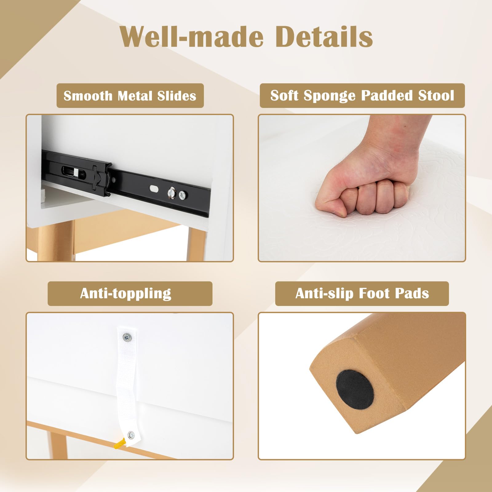 Upgrade your daily routine with this elegant and functional vanity set. Featuring a round LED mirror with 3 dimmable light modes, this vanity offers the perfect lighting for makeup, hair styling, or skincare. The set includes a cushioned stool for comfort and a spacious table with 4 drawers to keep your beauty essentials organized. Built for safety and durability, it comes with an anti-toppling device, solid pine wood legs, and non-slip pads for added stability. A modern addition to any bedroom.