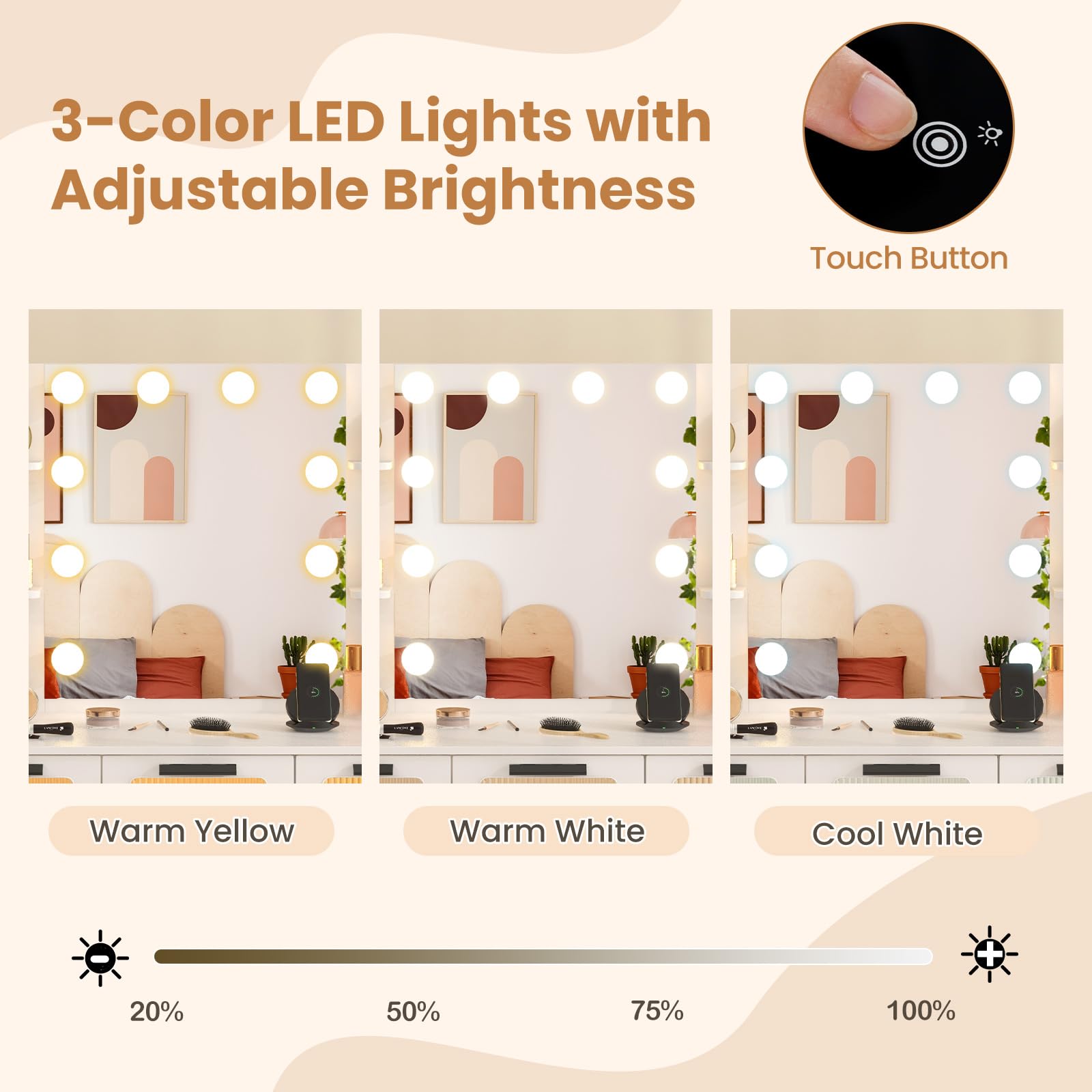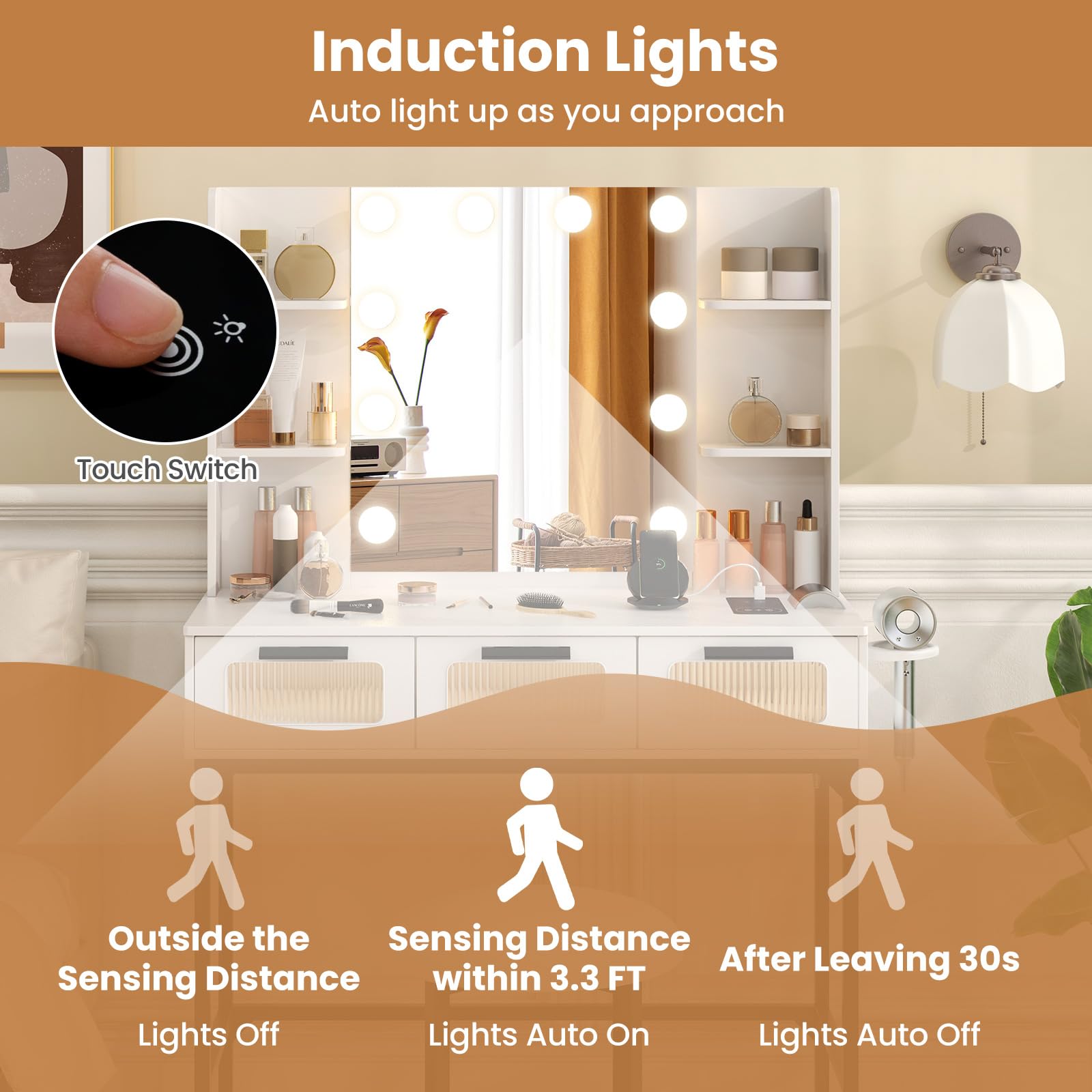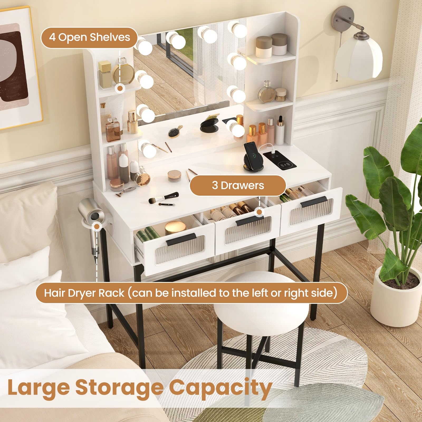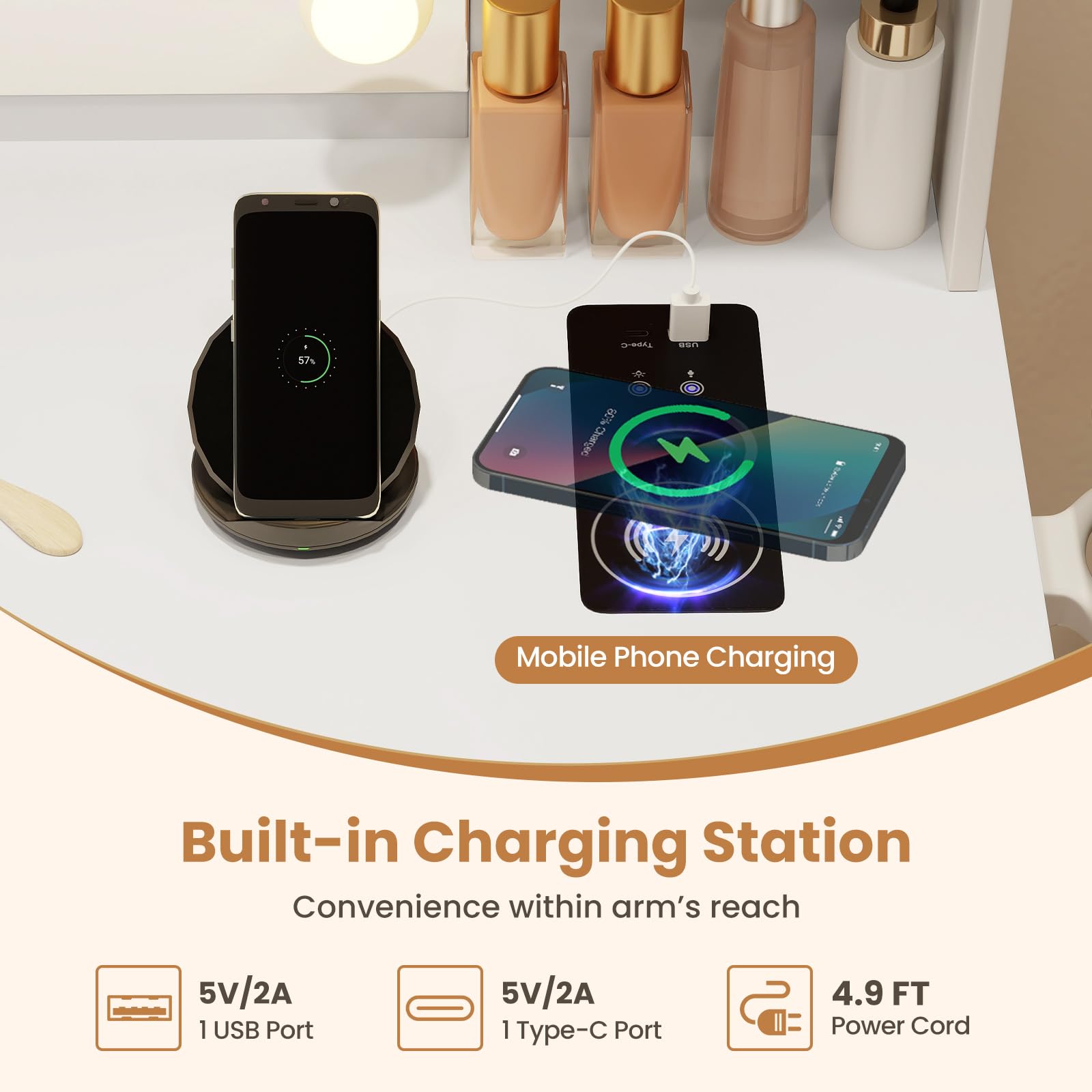 Upgrade your daily routine with our elegant and functional dressing table! Featuring a built-in charging station with one USB port, one Type-C port, and fast charging capabilities, you can easily power your devices while getting ready. The high-definition lighted mirror offers adjustable brightness and three color temperature options to suit your needs. The integrated LED lights come with a smart motion sensor that automatically illuminates when you approach. Additionally, the table provides generous storage with multiple drawers and open shelves to keep your space organized. With its modern design and thoughtful features, this vanity is a stylish and practical gift for yourself or your loved ones.