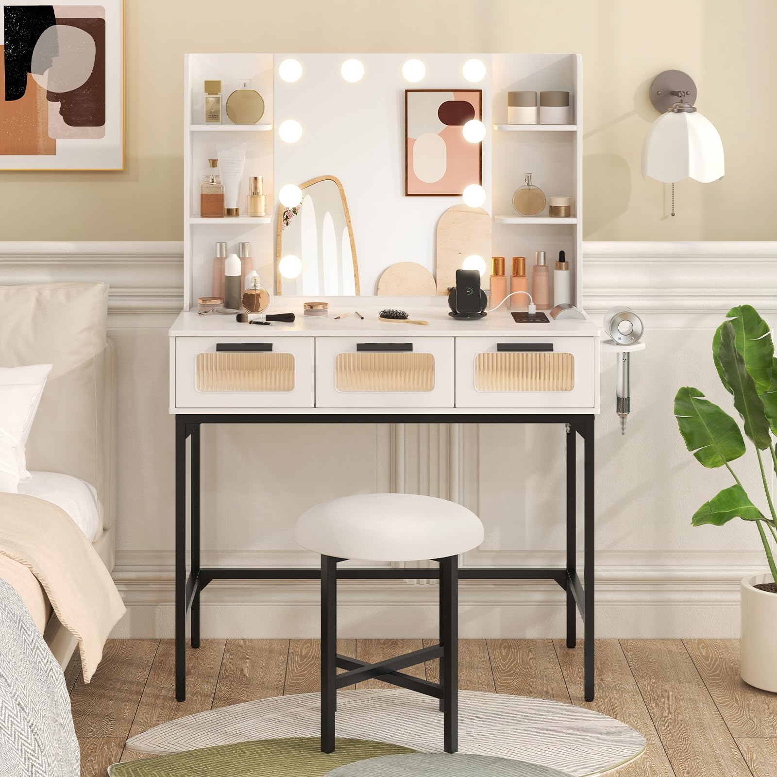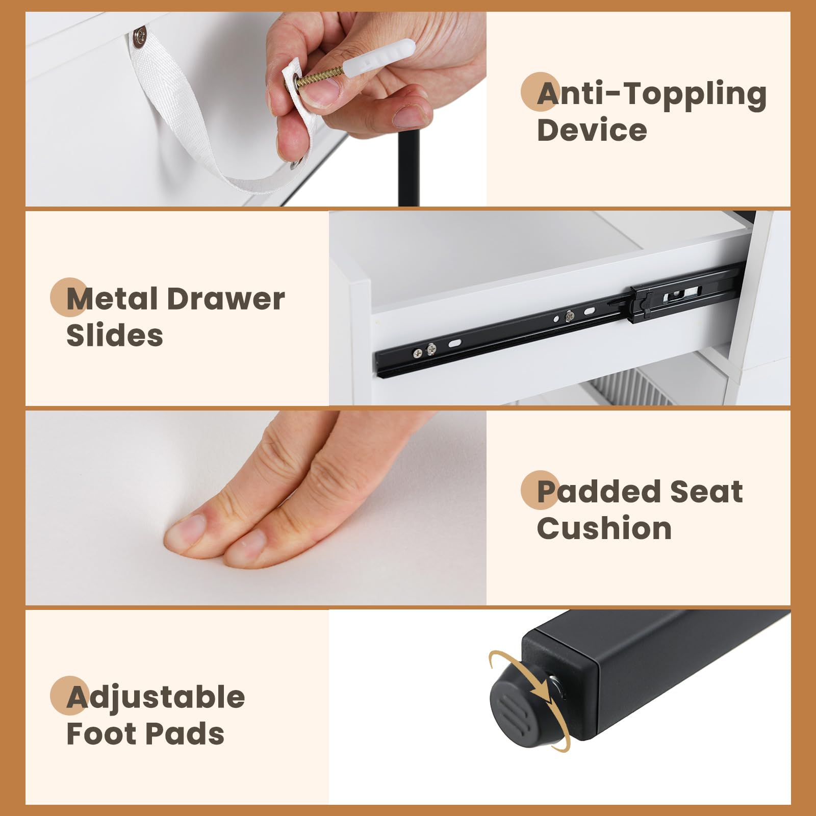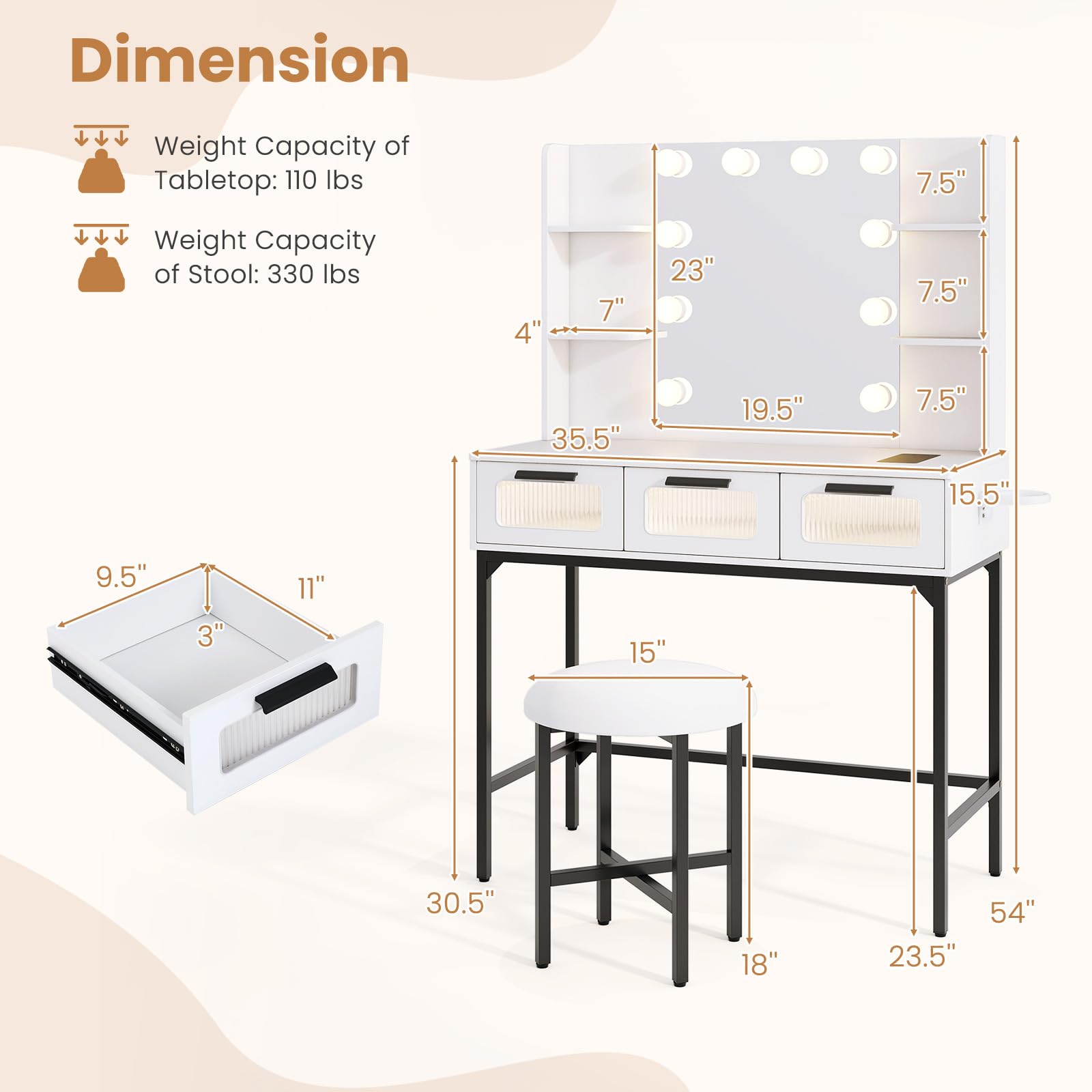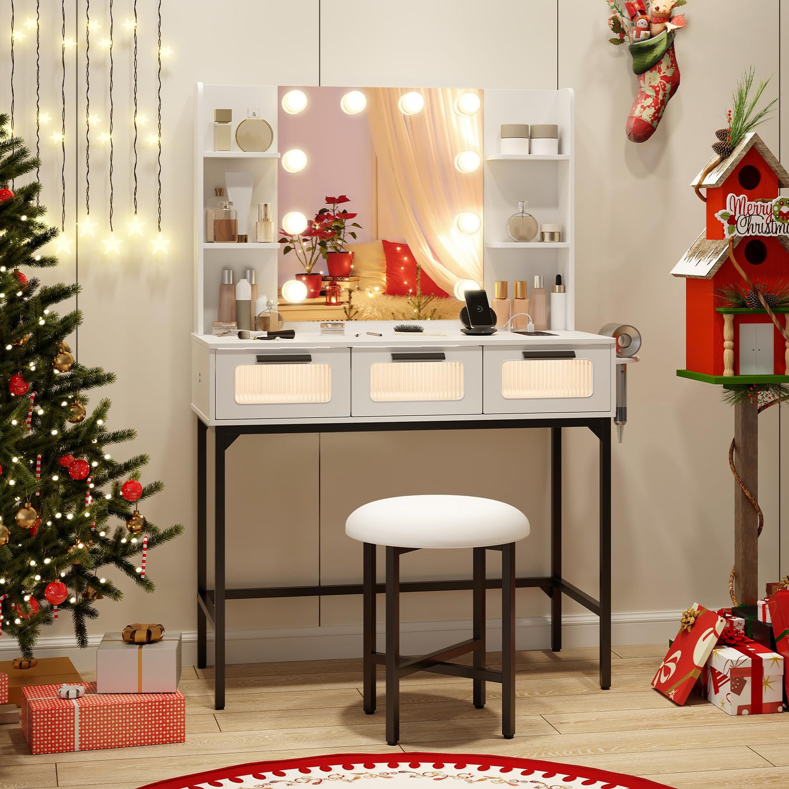 Upgrade your daily routine with our elegant and functional dressing table! Featuring a built-in charging station with one USB port, one Type-C port, and fast charging capabilities, you can easily power your devices while getting ready. The high-definition lighted mirror offers adjustable brightness and three color temperature options to suit your needs. The integrated LED lights come with a smart motion sensor that automatically illuminates when you approach. Additionally, the table provides generous storage with multiple drawers and open shelves to keep your space organized. With its modern design and thoughtful features, this vanity is a stylish and practical gift for yourself or your loved ones.