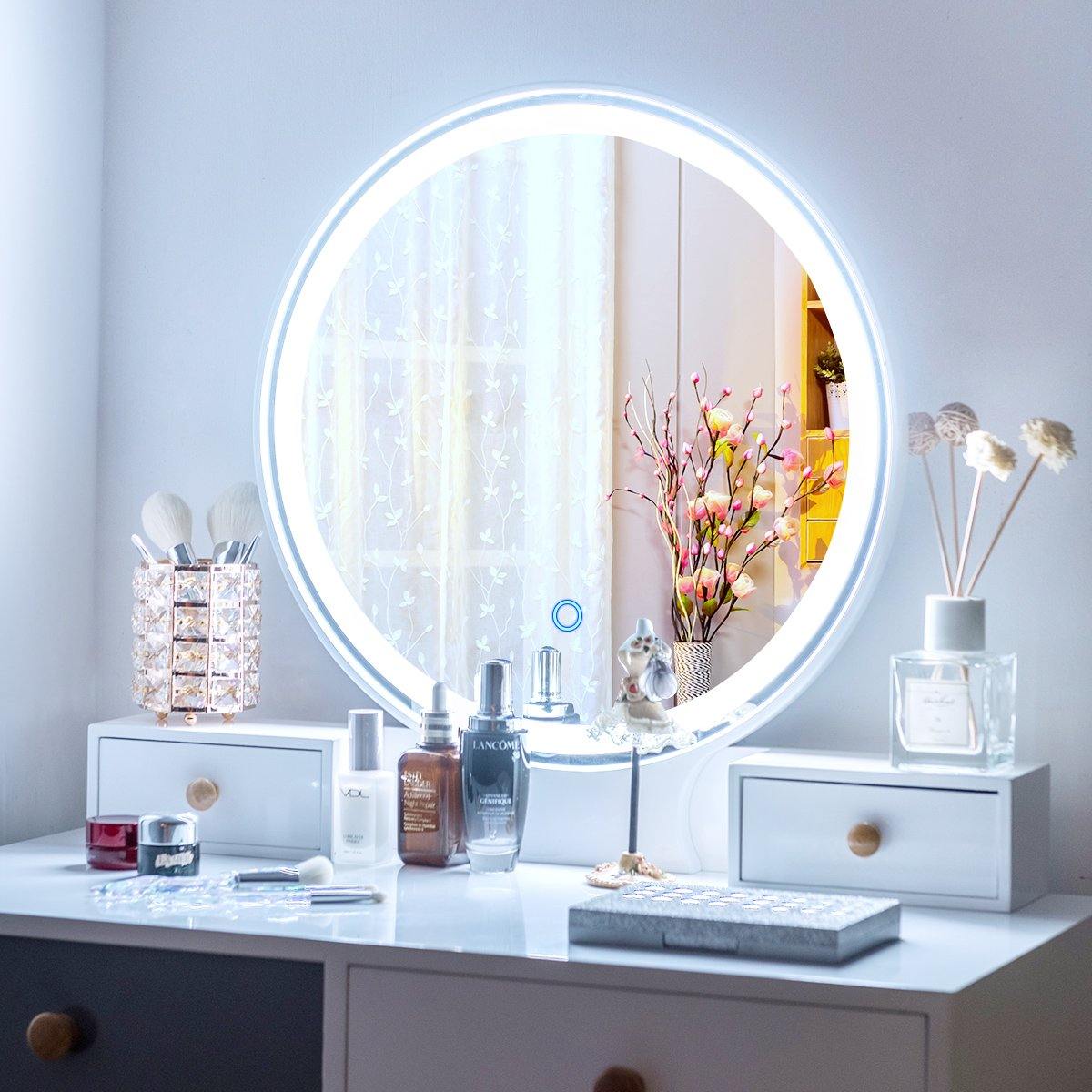 CHARMAID vanity set with lighted mirror will be a great gift for your wife, daughter or granddaughter. Two large drawers and two small drawers can help you organize jewelry and cosmetics. There are three colors of LED that can be adjusted to illuminate your beauty. Smart touch switches do not spark when opening or closing lamps and wet hand touch is also safe. This dresser is made of high quality material. Density board paint and solid wood legs make the dressing table stable and durable. This is a fantastic vanity, perfect size for a small space but doesn't feel small.