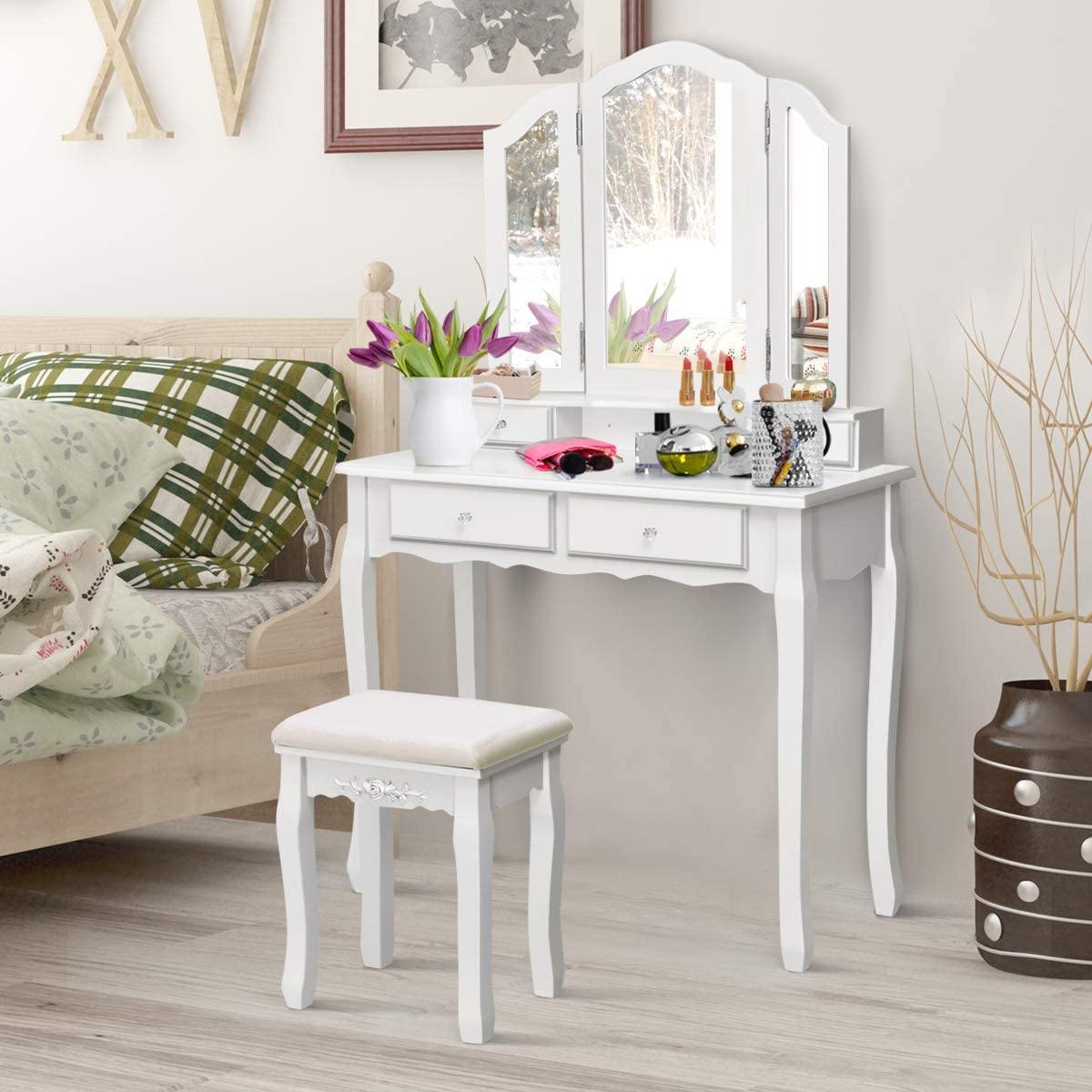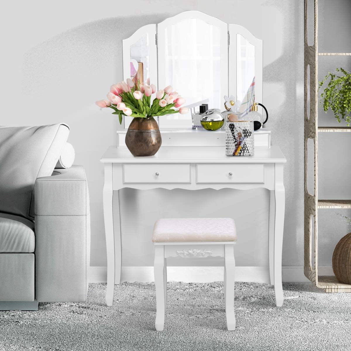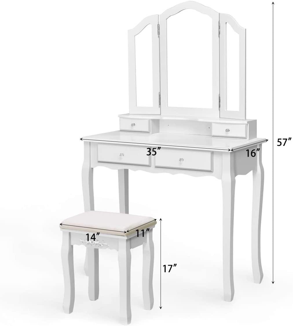 Are you looking for forward to owning a wonderful dressing table set? Come and have a look at our glamorous dressing table set! It will be a fantastic product that let you realize your princess dream. It is has a white appearance, which makes it look elegant. It can be a fine display of your room. This dressing table set includes a mirrored dressing table with four drawers and a stool. One of the biggest characteristic of this dressing table set is that it has three square mirrors. How special it is! You can well make yourself up in front of them. And the stool has a really comfortable top. When you are sitting on it and dressing yourself, you will feel that it's really an enjoyment. The table with mirror and drawers is of great value. A lot of things can be stored in the four storage drawers and the spacious table top. For example, your makeup, jewelries, accessories, ornaments and other things. Made of wood and MDF, our product is stable and can serve you for a long time. What a perfect dressing table set! Don't hesitate! Come and buy one!