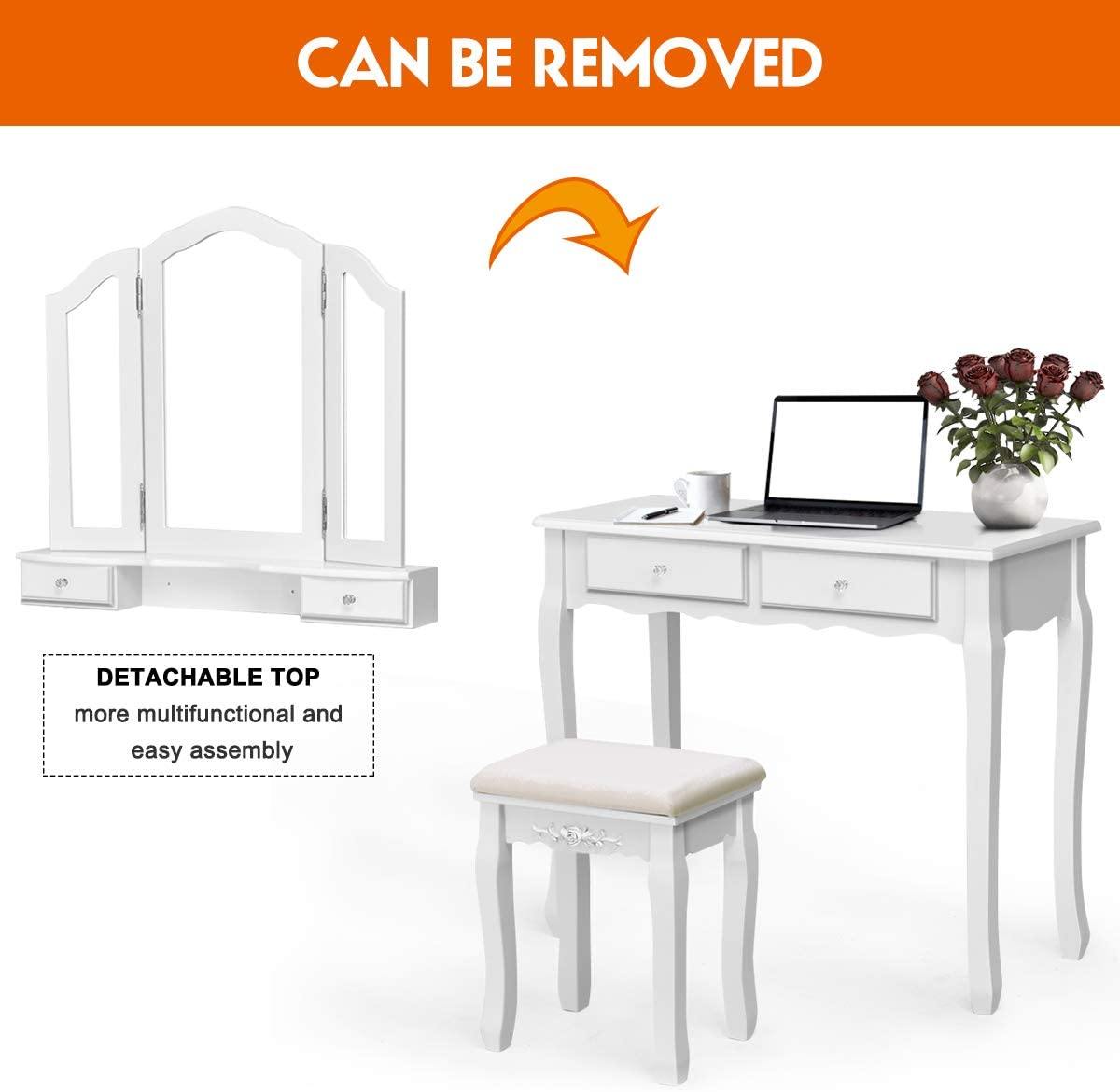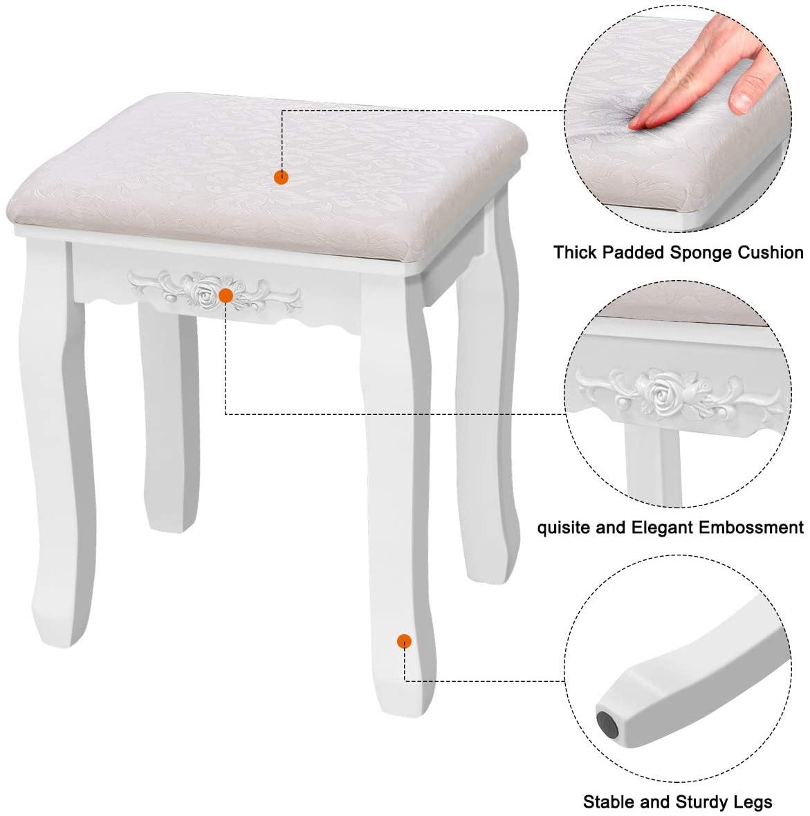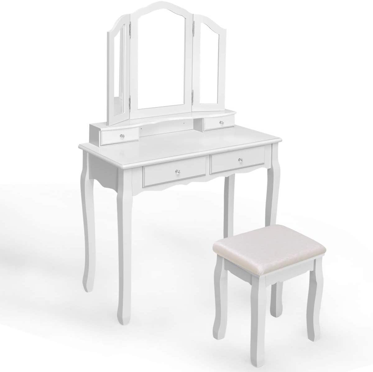 Are you looking for forward to owning a wonderful dressing table set? Come and have a look at our glamorous dressing table set! It will be a fantastic product that let you realize your princess dream. It is has a white appearance, which makes it look elegant. It can be a fine display of your room. This dressing table set includes a mirrored dressing table with four drawers and a stool. One of the biggest characteristic of this dressing table set is that it has three square mirrors. How special it is! You can well make yourself up in front of them. And the stool has a really comfortable top. When you are sitting on it and dressing yourself, you will feel that it's really an enjoyment. The table with mirror and drawers is of great value. A lot of things can be stored in the four storage drawers and the spacious table top. For example, your makeup, jewelries, accessories, ornaments and other things. Made of wood and MDF, our product is stable and can serve you for a long time. What a perfect dressing table set! Don't hesitate! Come and buy one!