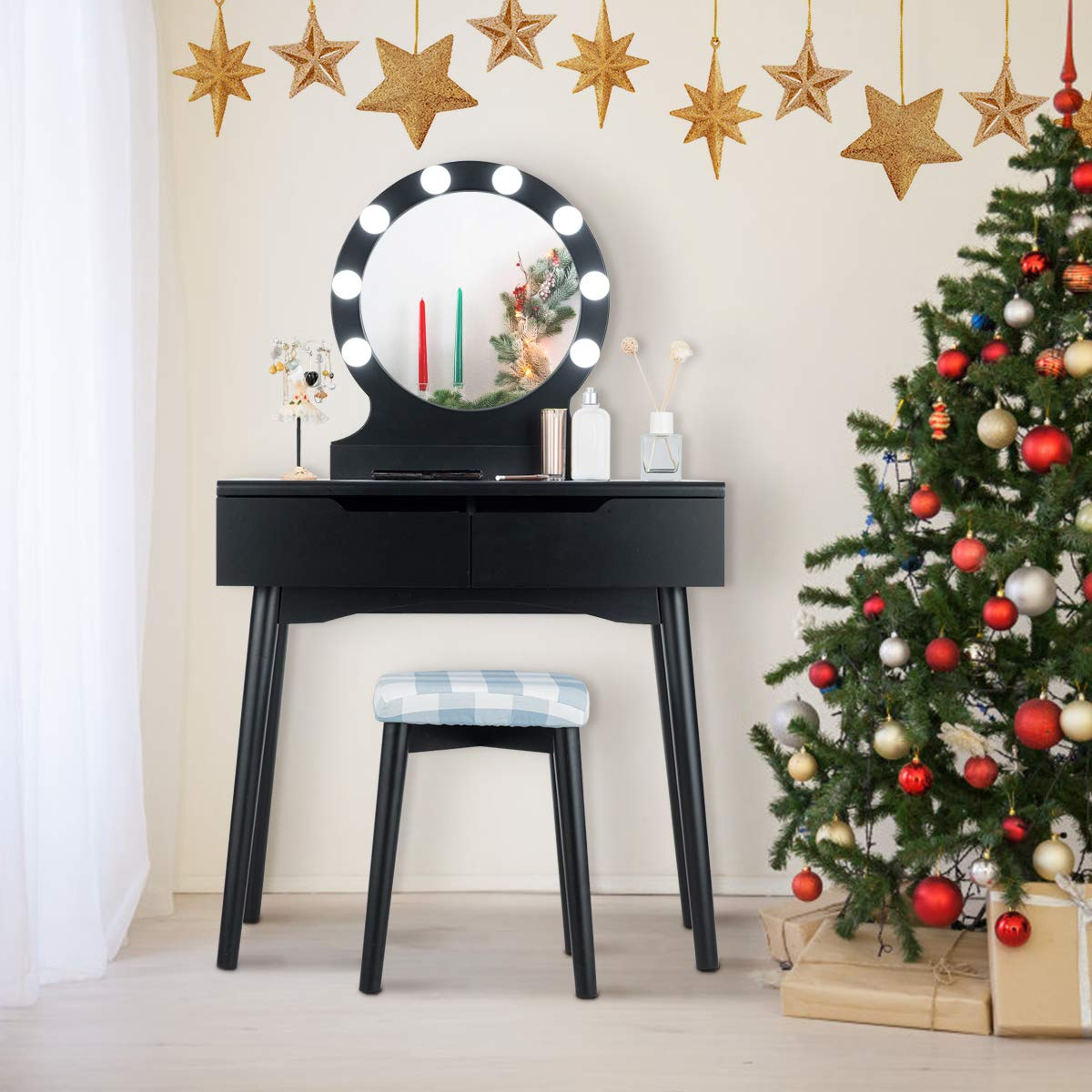 Get up in the morning and start the daywith the perfect makeup. If you're looking for a unique dresser, don't missthis amazing vanity table with lights. This is our elegant and simple dressingtable with round mirrors and cushioned stools. Made of high quality P2 MDF and solidwood, durable construction with 100% solid wood legs to ensure the enoughsupport for adults and child. Soft cushioned stool with removable cover bringsgreat comfort and relieves fatigue during long periods of makeup. Besides,comes with 11LED bulbs ,3 of which are spare and others around the edge of themirror. More, the brightness of lights is adjustable. The wide desktop and 2large drawers with smooth slide rails provide enough storage space for yourdaily needs.