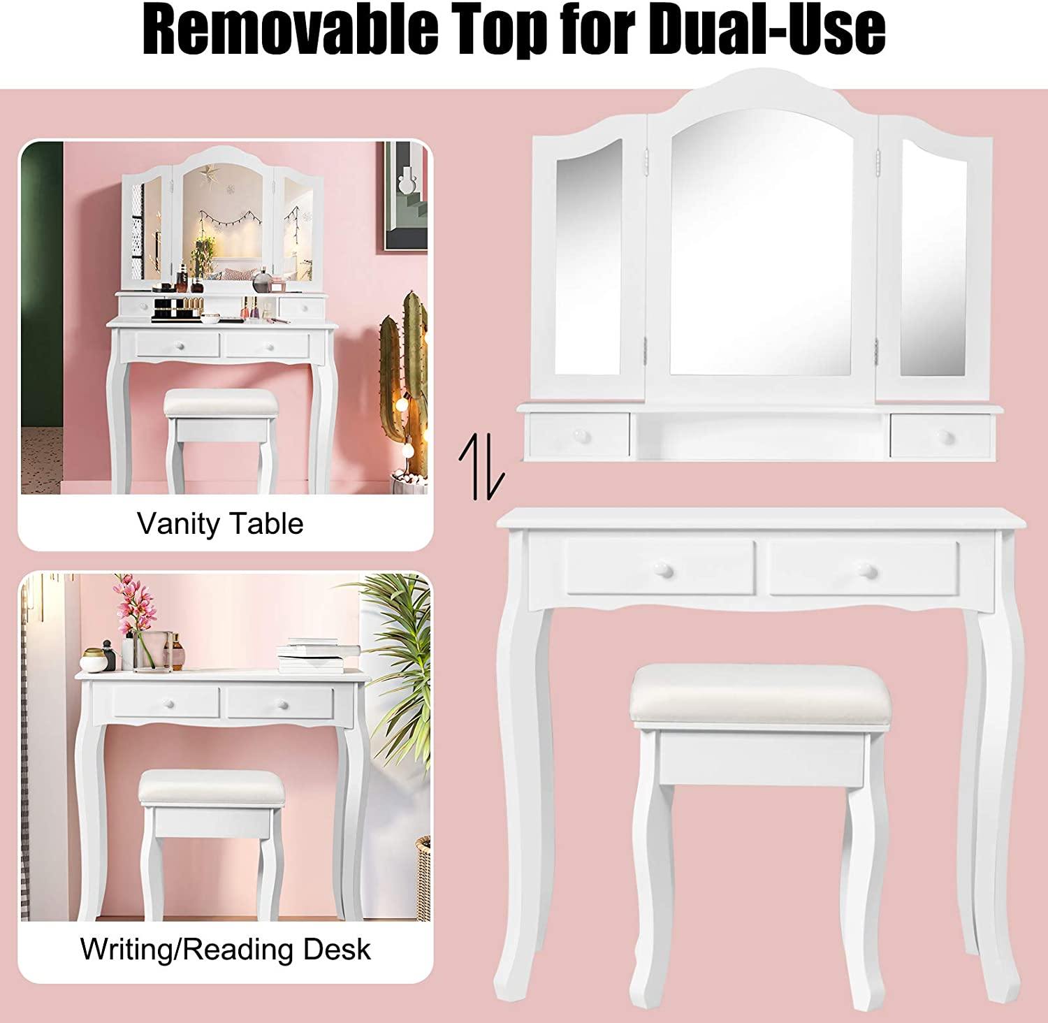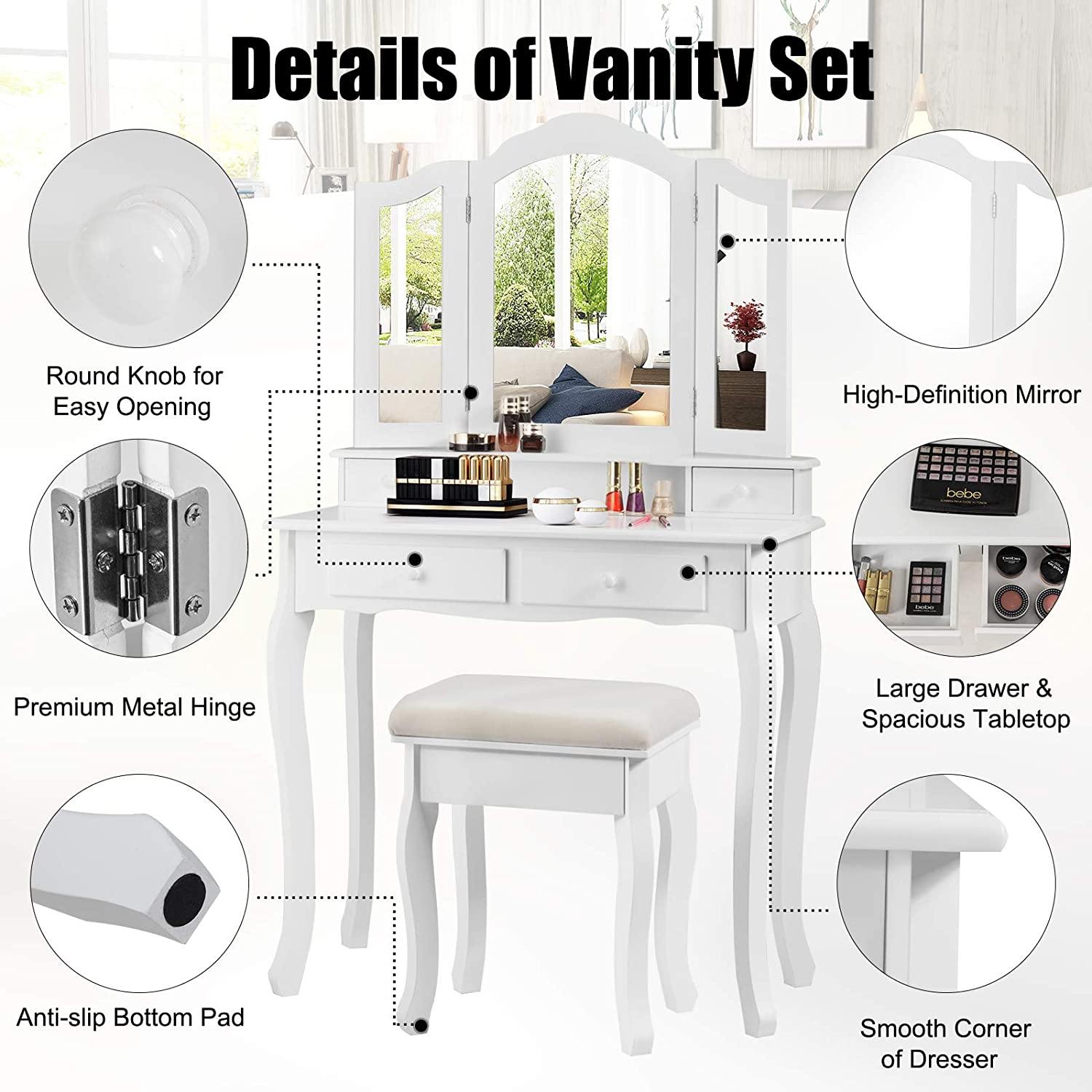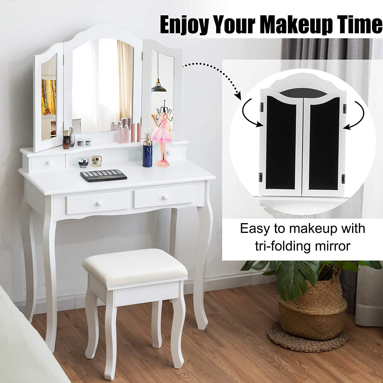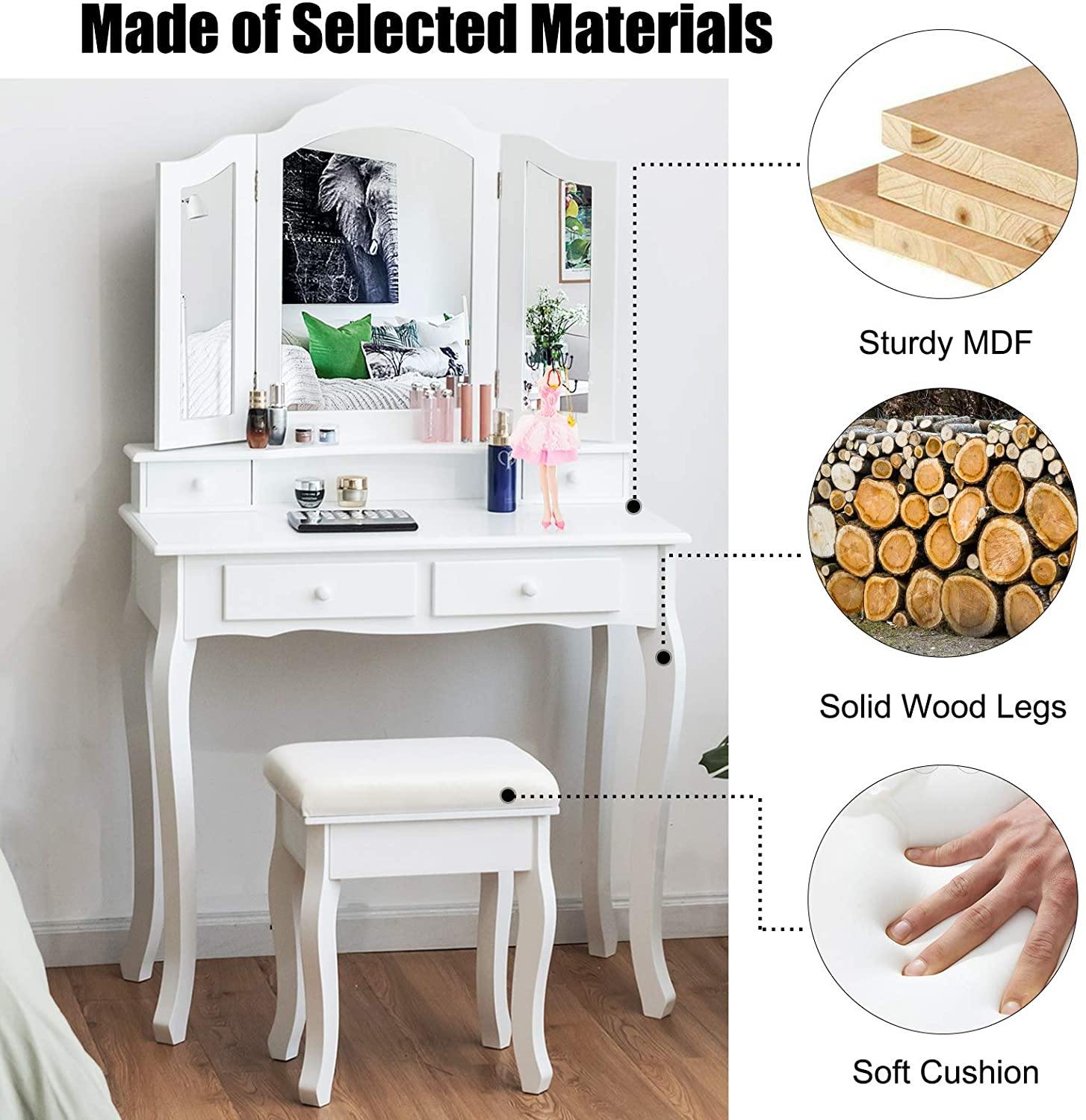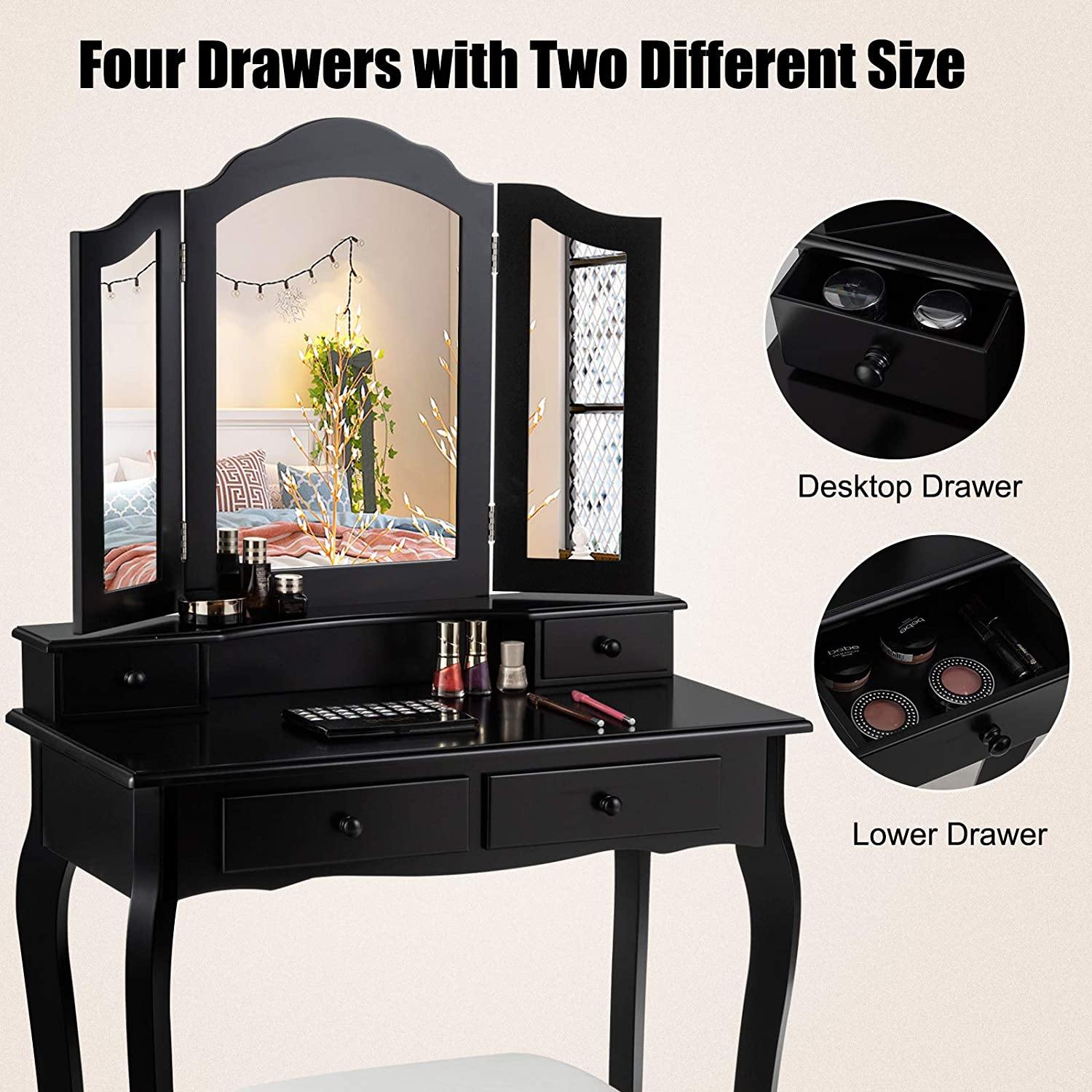 It will be a fantastic product that let you realize your princess dream. It is in classic black color, which makes it look compact. It can be a fine display of your room. This dressing table set includes a mirrored dressing table with four drawers and a stool. One of the biggest characteristic of this dressing table set is that it has a tri-folding mirror, two 180-degree folding mirror and a center mirror help you view your face or hair from multiple angles. You can well make yourself up in front of them. And the stool has a really comfortable top. When you are sitting on it and dressing yourself, you will feel that it's really an enjoyment. The table with mirror and drawers is of great value. A lot of things can be stored in the four storage drawers and the spacious table top. For example, your makeup, jewelries, accessories, ornaments and other things. Made of wood and MDF, our product is stable and can serve you for a long time.
