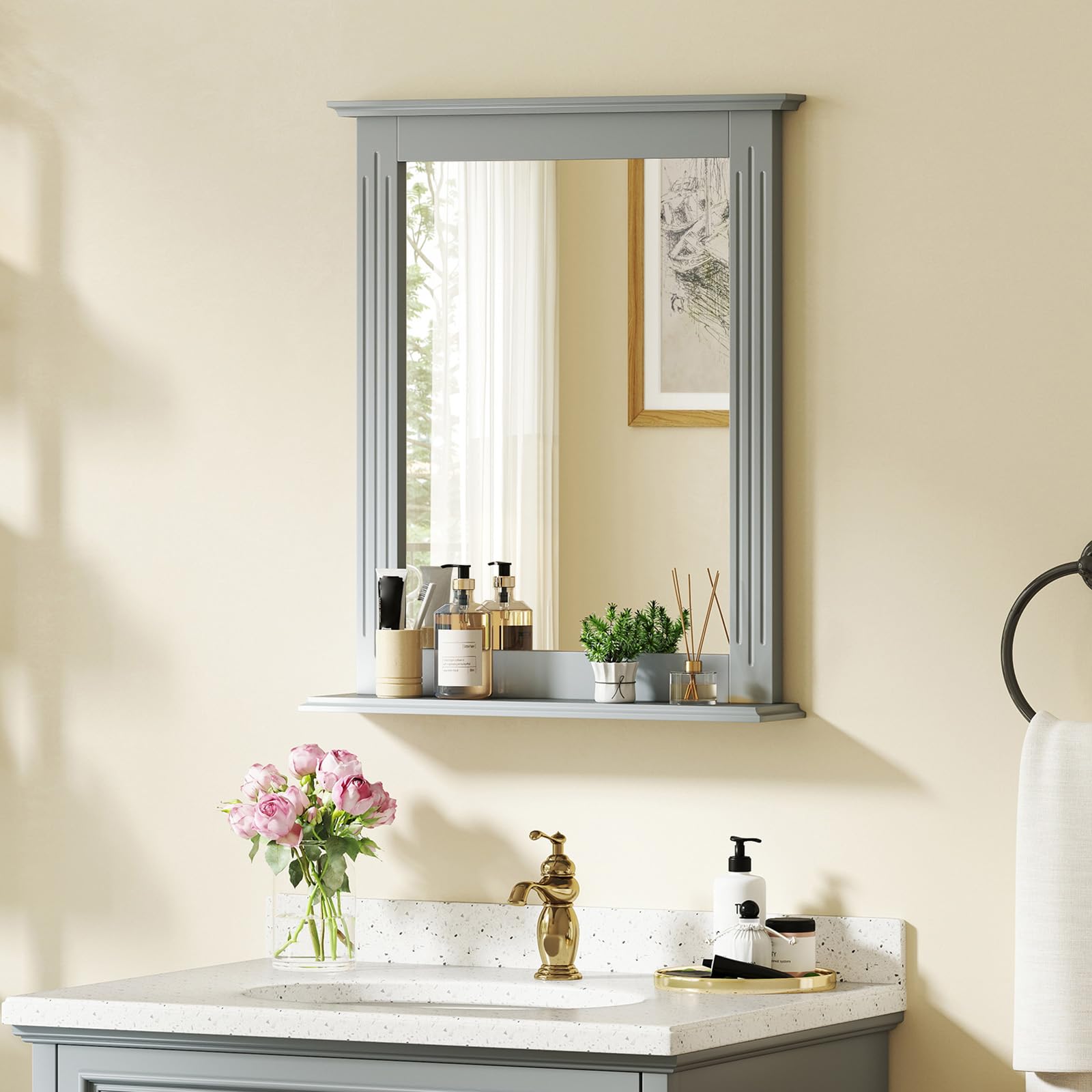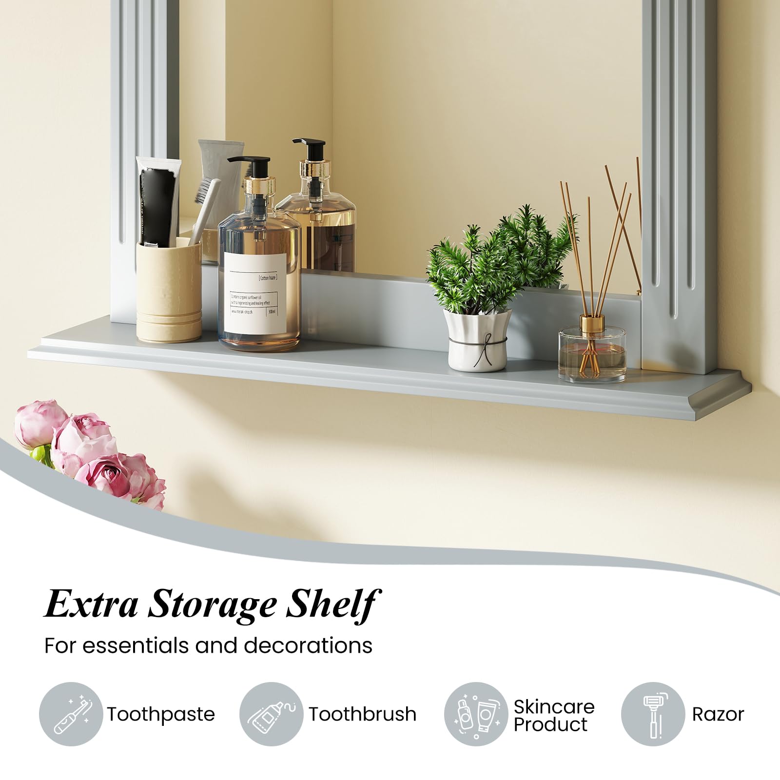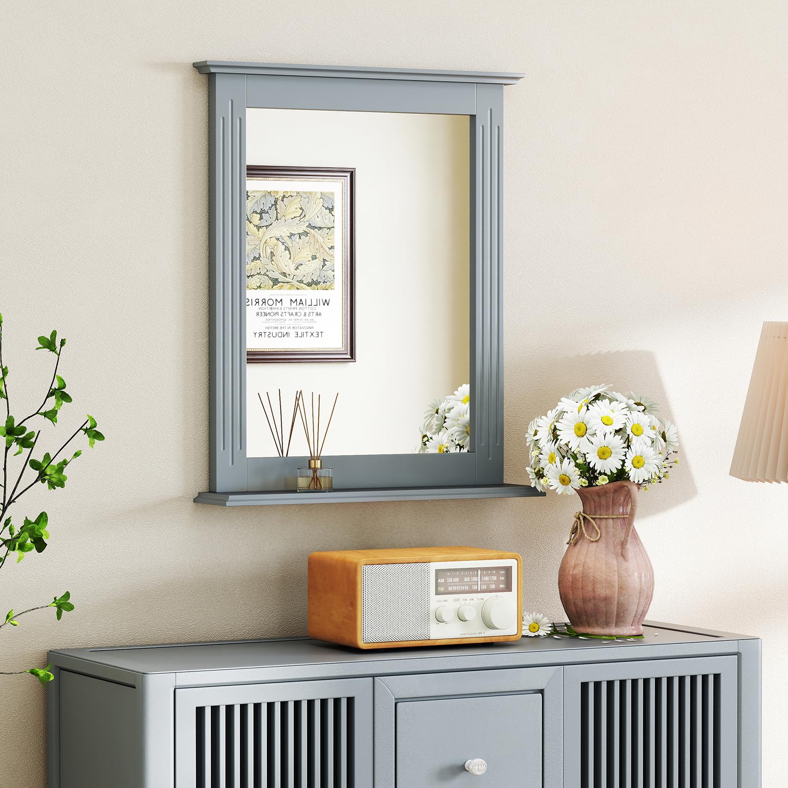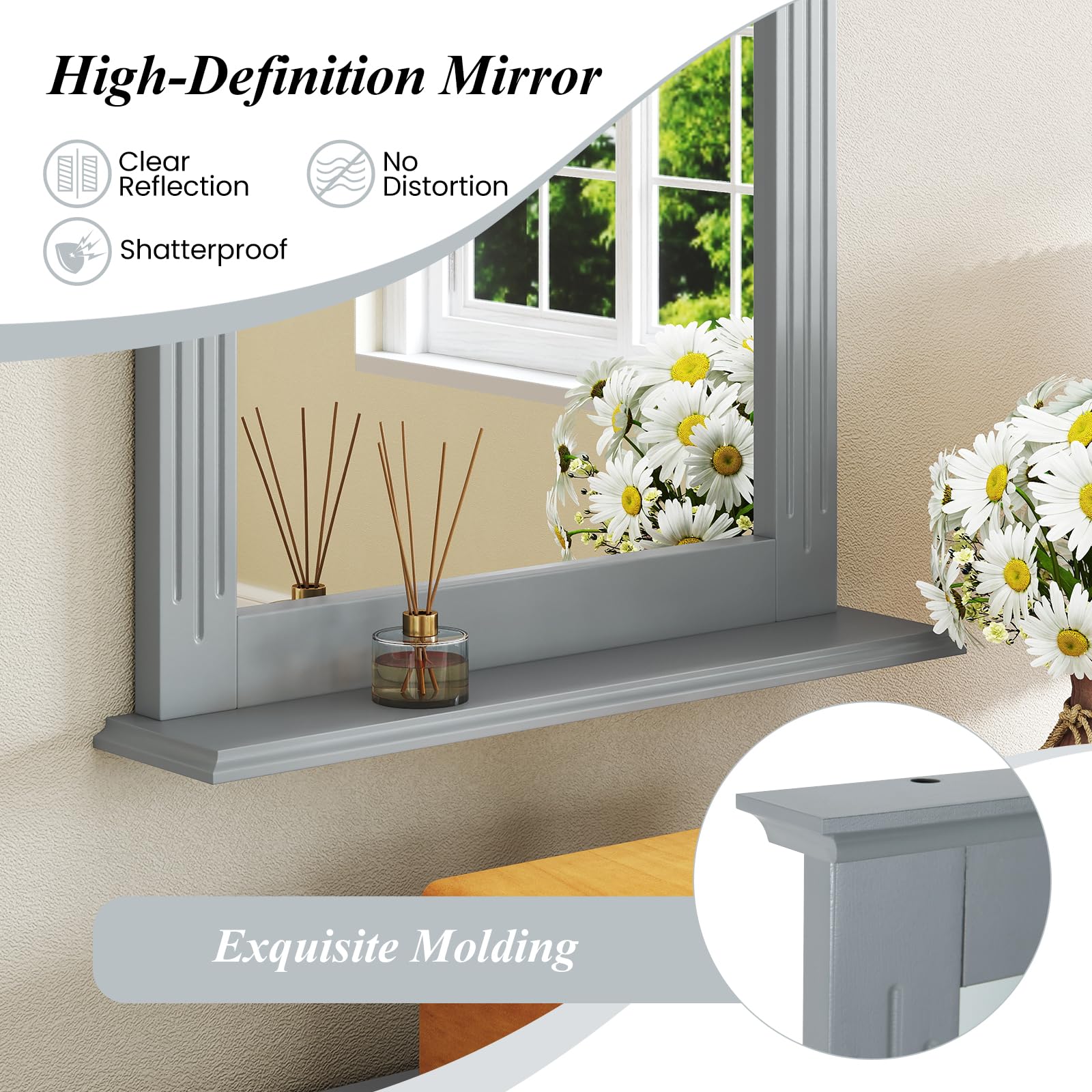 This wall-mounting mirror features high-definition, shatterproof glass for a crystal-clear reflection. The included shelf offers convenient storage for toiletries, keys, or decorative items. The robust and elegantly molded frame adds durability and farmhouse charm. Blending seamlessly with various aesthetics, this wall mirror with a shelf is a practical and stylish addition to bathrooms, entryways, living rooms, and more.