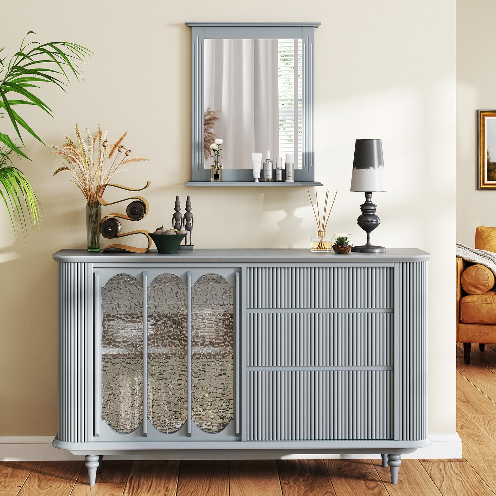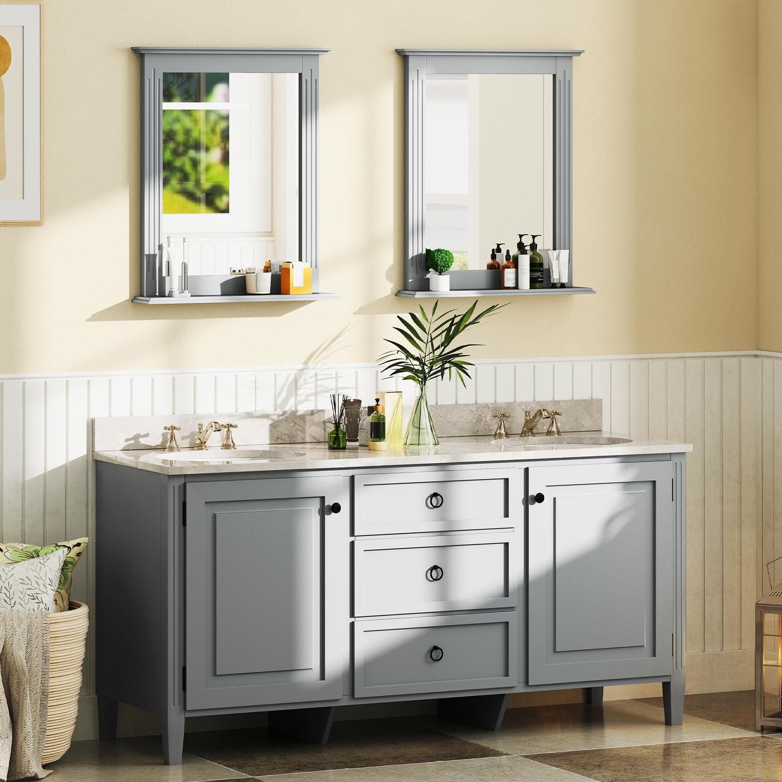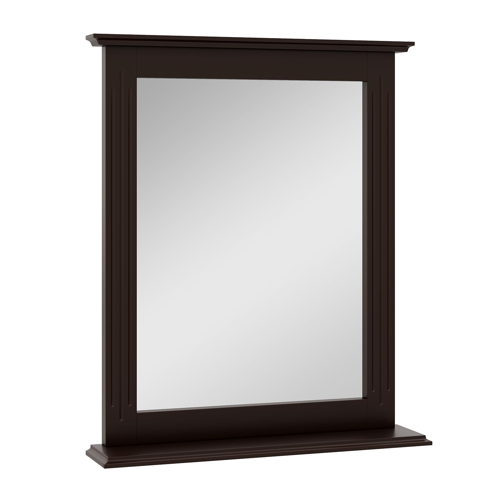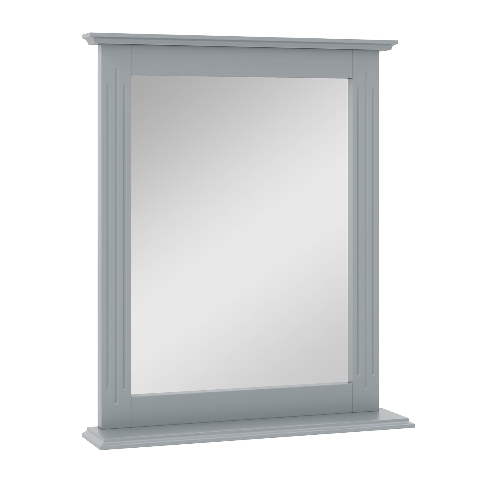 This wall-mounting mirror features high-definition, shatterproof glass for a crystal-clear reflection. The included shelf offers convenient storage for toiletries, keys, or decorative items. The robust and elegantly molded frame adds durability and farmhouse charm. Blending seamlessly with various aesthetics, this wall mirror with a shelf is a practical and stylish addition to bathrooms, entryways, living rooms, and more.